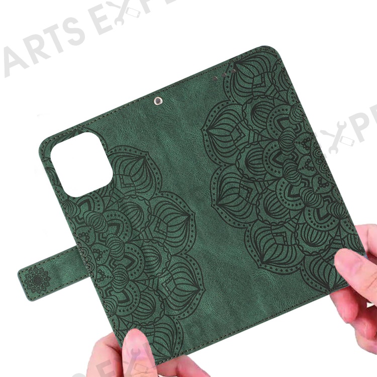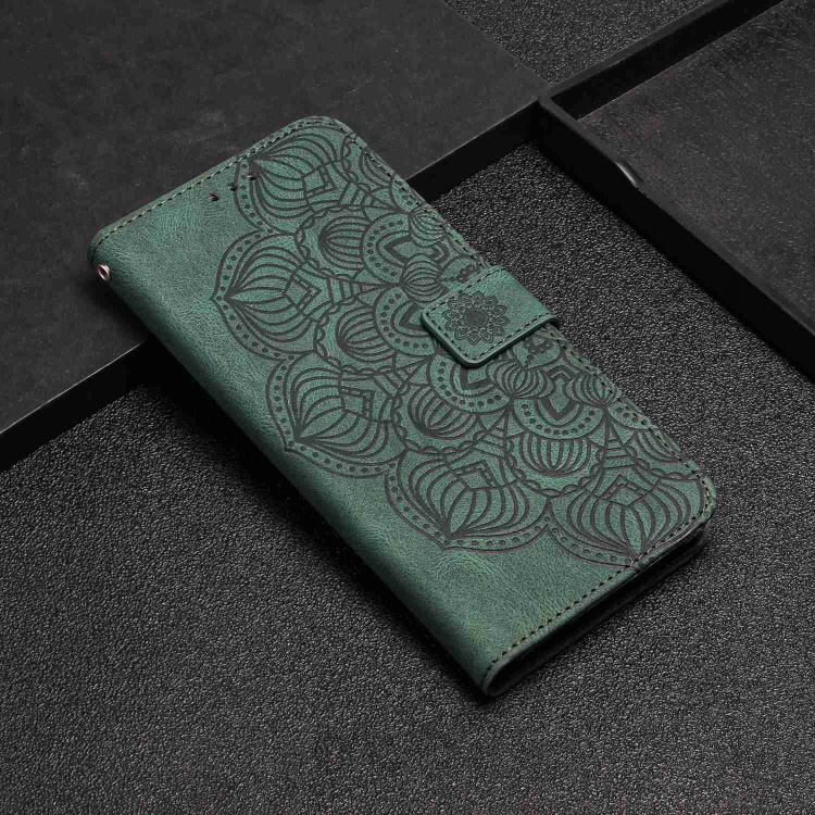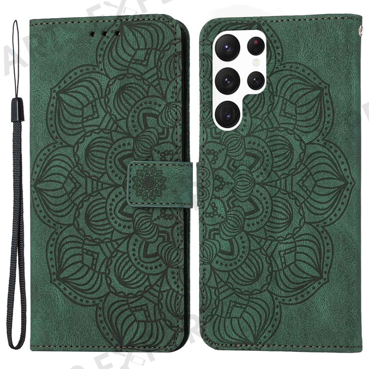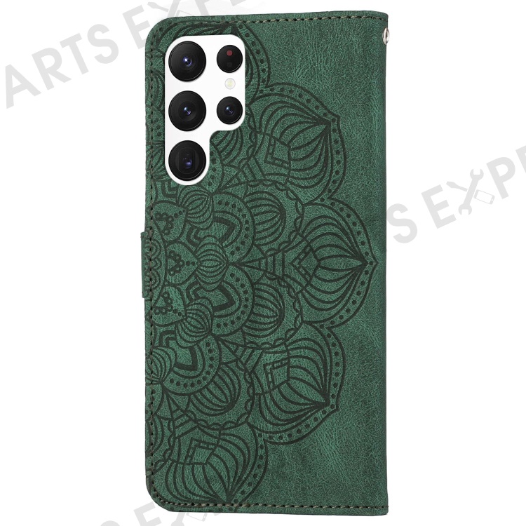 For Samsung Galaxy S23 Ultra PU Leather Soft TPU Folio Flip Cover Imprinted Mandala Flower Wallet Phone Case with Strap - Green