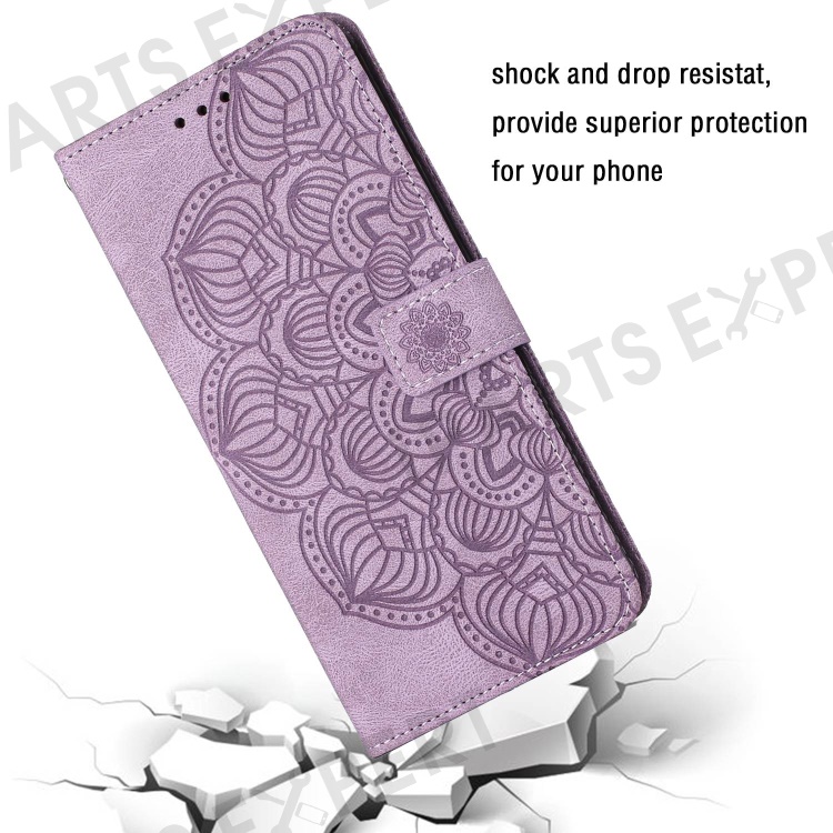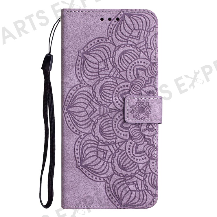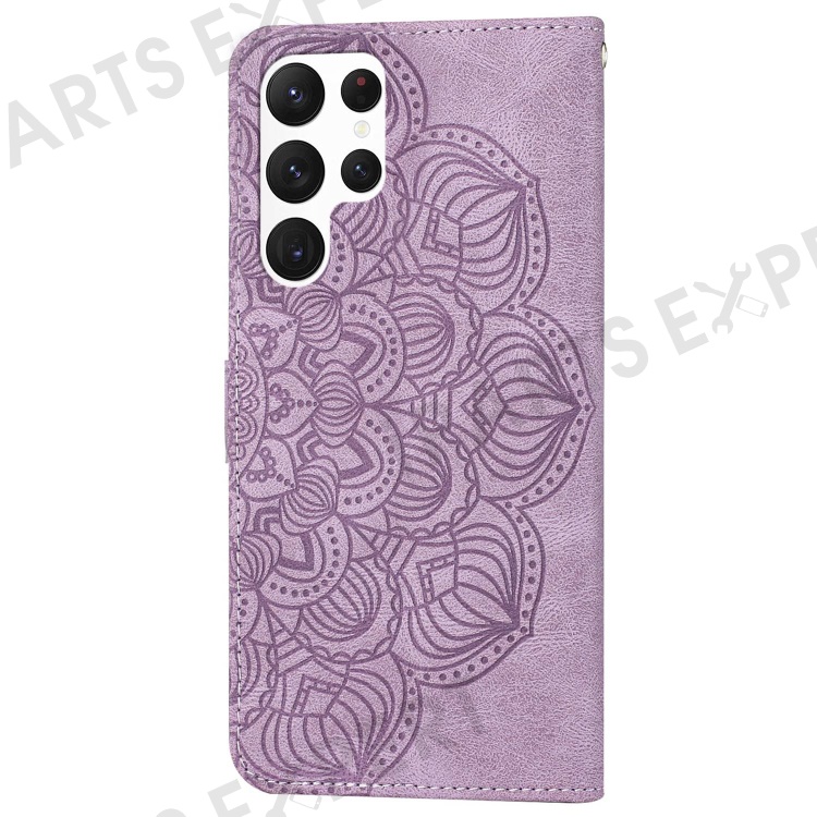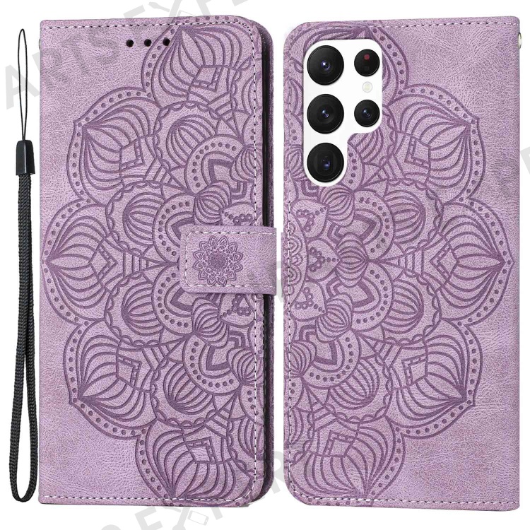 For Samsung Galaxy S23 Ultra PU Leather Soft TPU Folio Flip Cover Imprinted Mandala Flower Wallet Phone Case with Strap - Purple