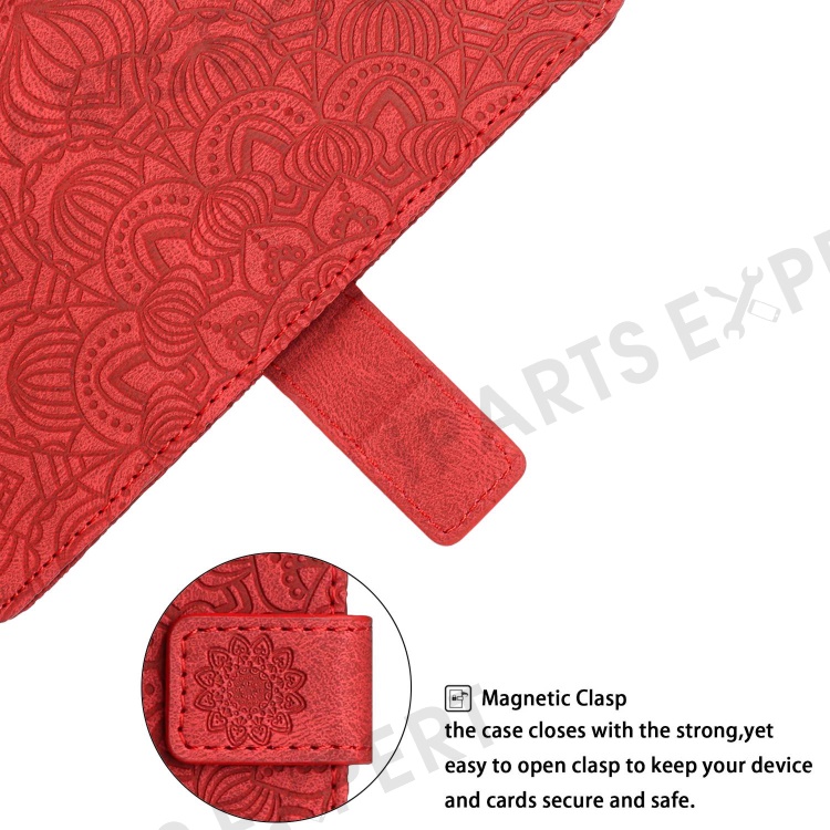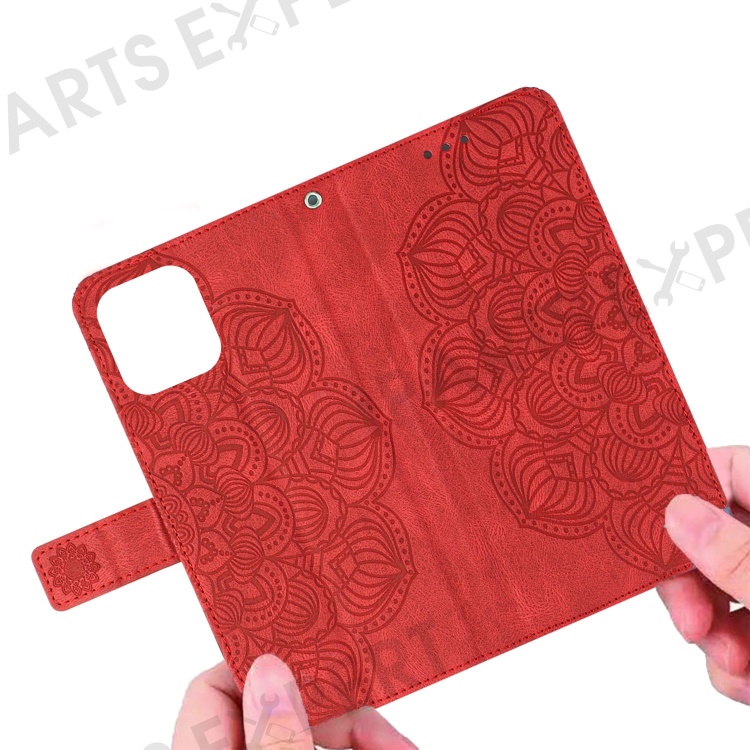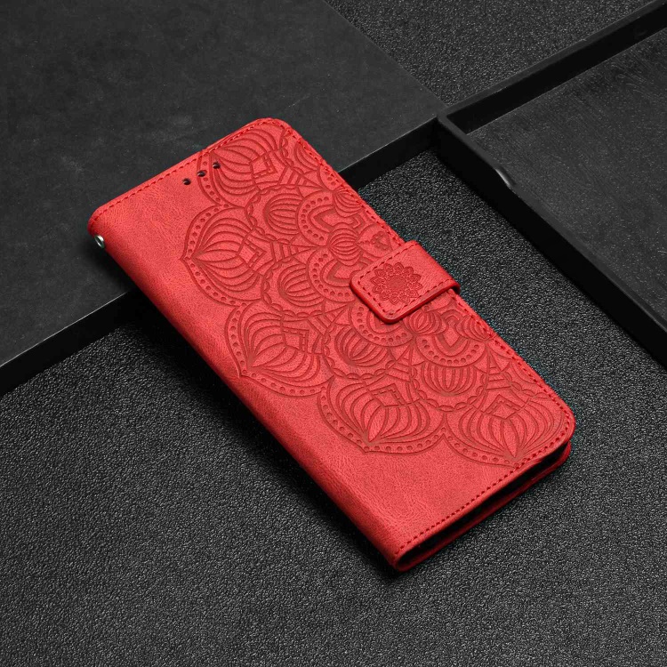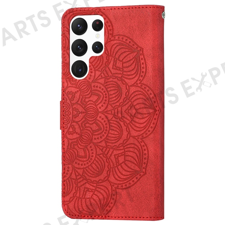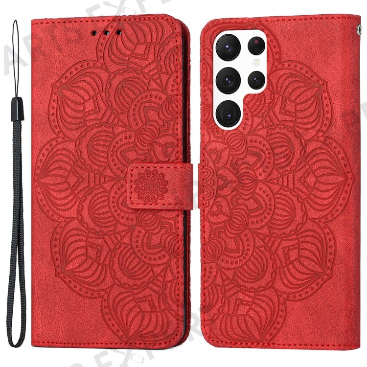 For Samsung Galaxy S23 Ultra PU Leather Soft TPU Folio Flip Cover Imprinted Mandala Flower Wallet Phone Case with Strap - Red