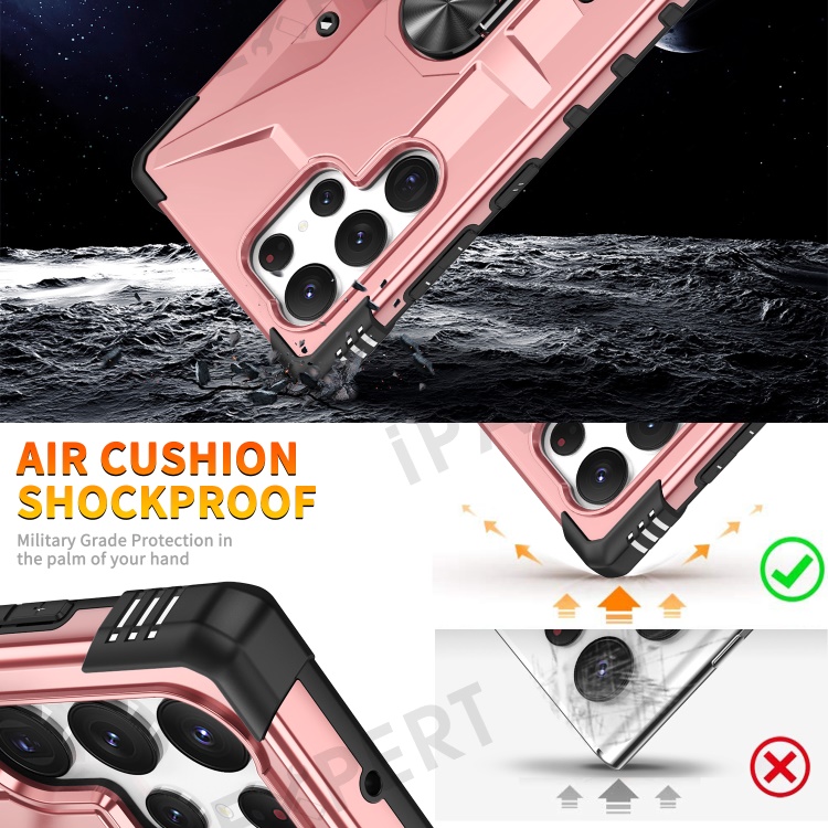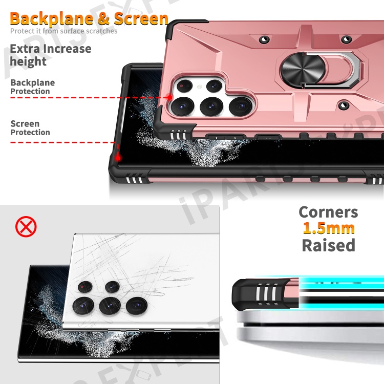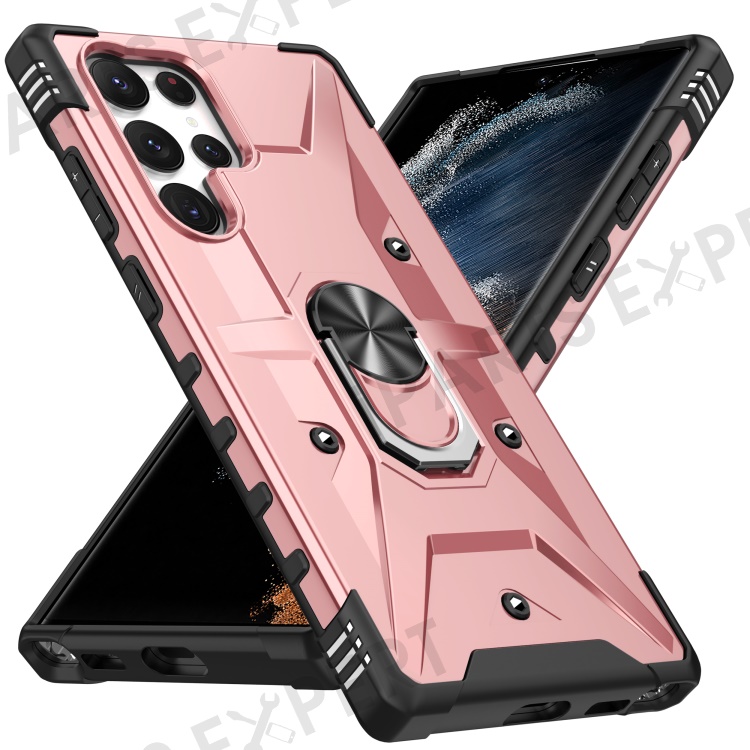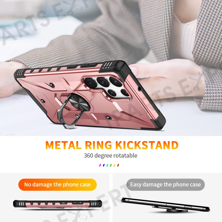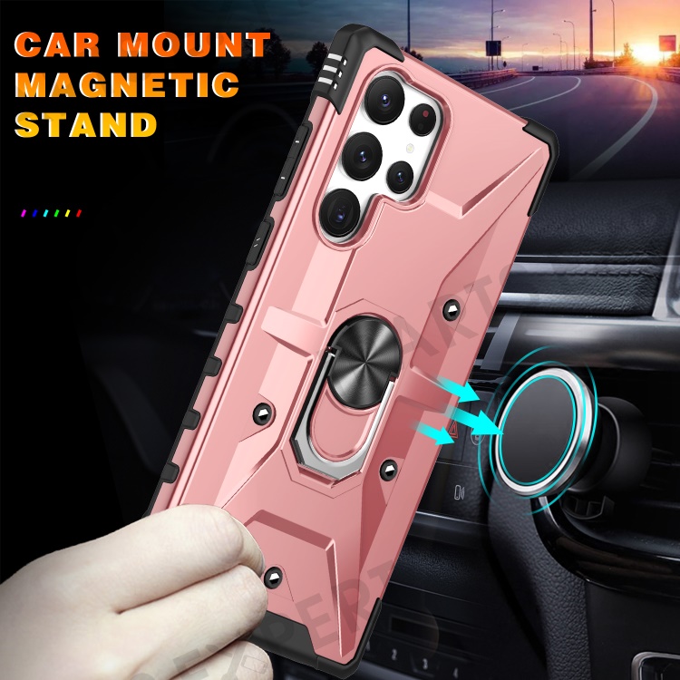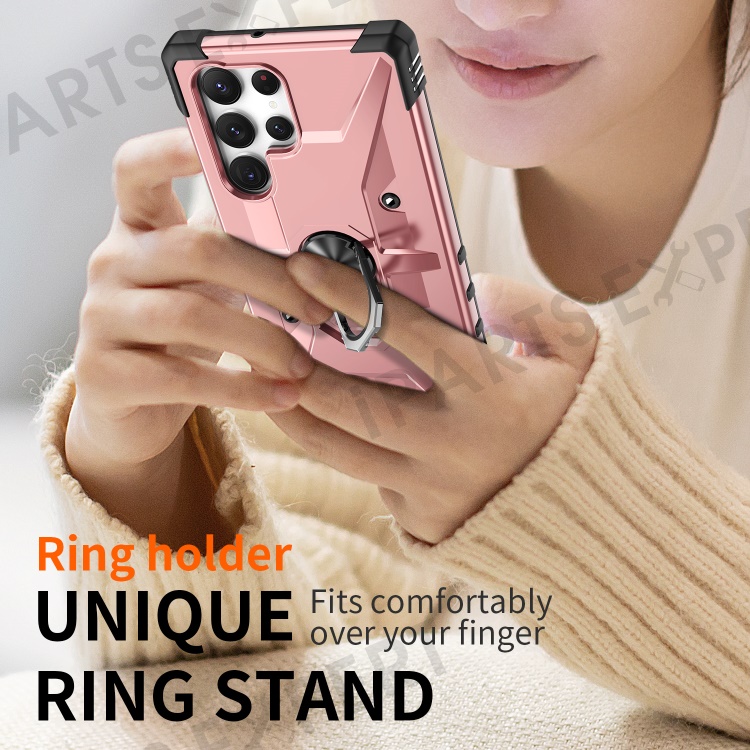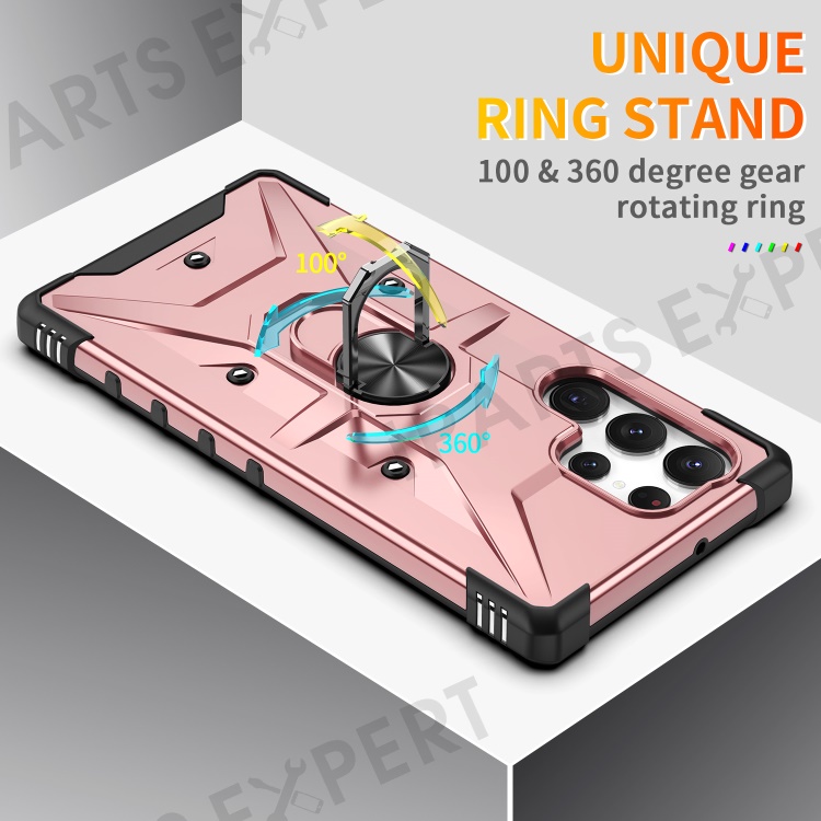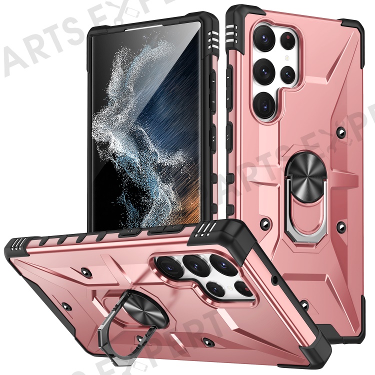 For Samsung Galaxy S23 Ultra Ring Car Mount Kickstand Phone Case Collision Resistant Hard PC Soft TPU Hybrid Military-Grade Shockproof Cover - Rose Gold