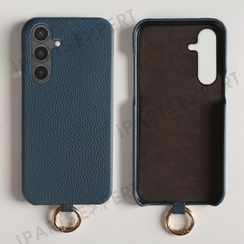 For Samsung Galaxy S24 Case with Lanyard Genuine Cow Leather PC Phone Back Cover - Blue