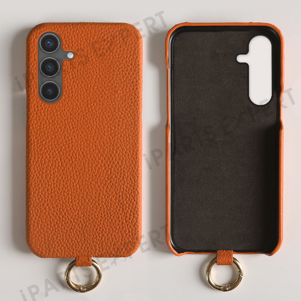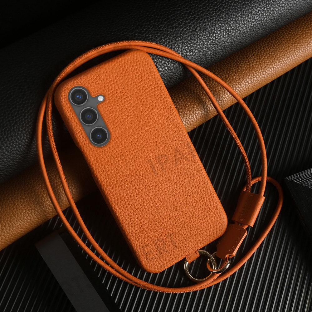 For Samsung Galaxy S24 Case with Lanyard Genuine Cow Leather PC Phone Back Cover - Orange