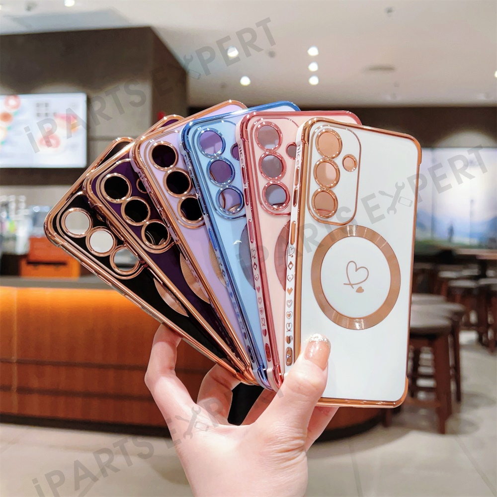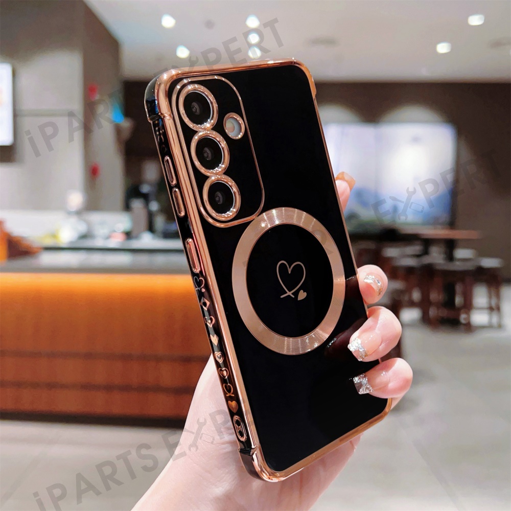 For Samsung Galaxy S24 FE Magnetic Case Electroplated TPU Phone Cover Hollow Love Hearts - Black