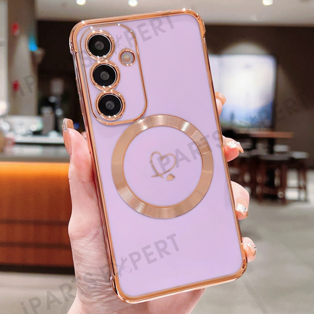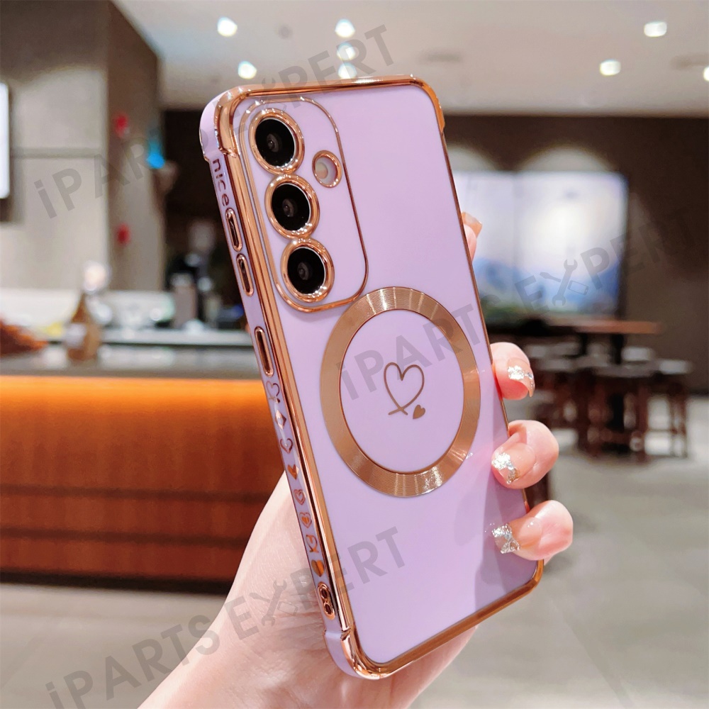 For Samsung Galaxy S24 FE Magnetic Case Electroplated TPU Phone Cover Hollow Love Hearts - Purple