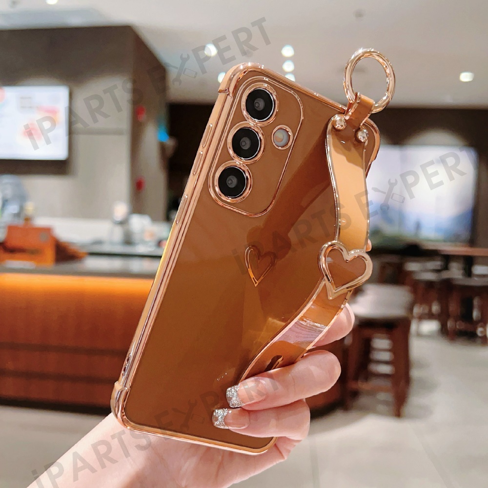 For Samsung Galaxy S24 FE Case Electroplated Heart Pattern TPU Phone Back Cover with Wristband Kickstand - Brown