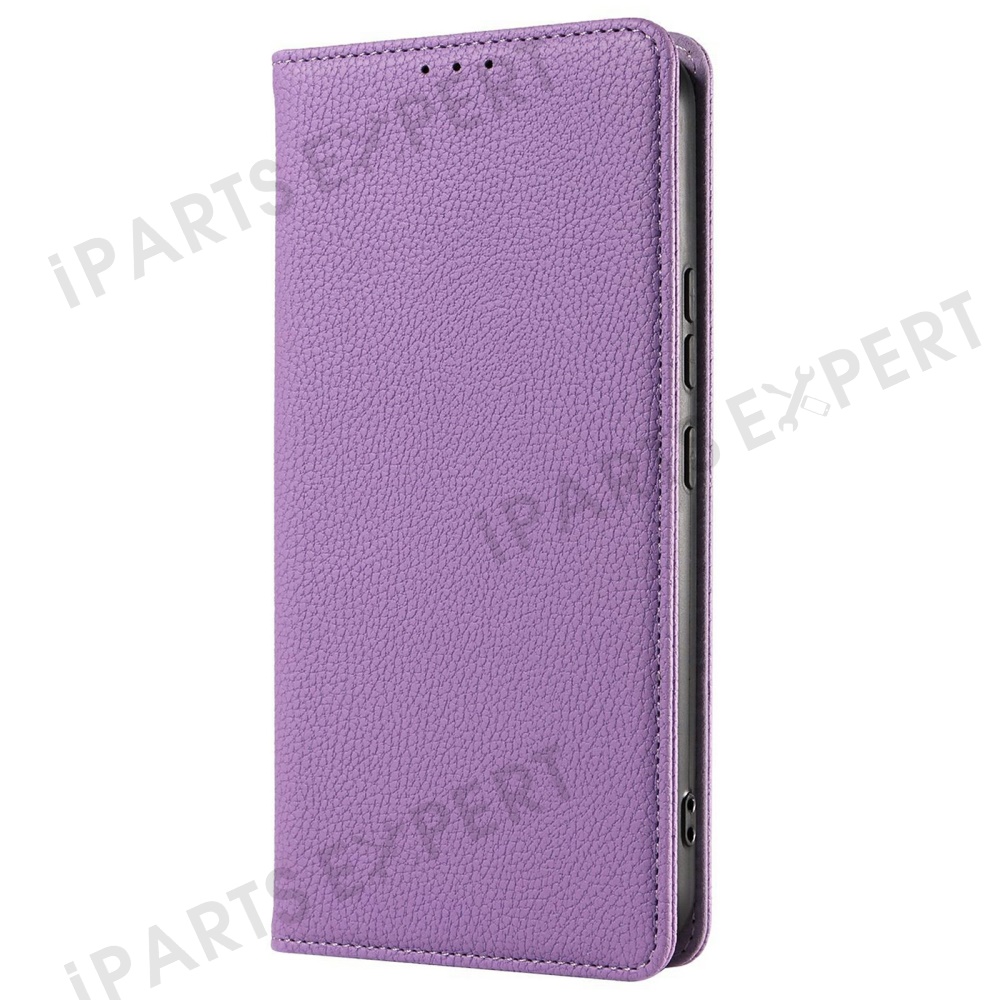 For Samsung Galaxy S24 FE Case Magnetic Litchi Texture Wallet Leather Phone Cover with Wrist Strap - Purple