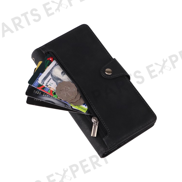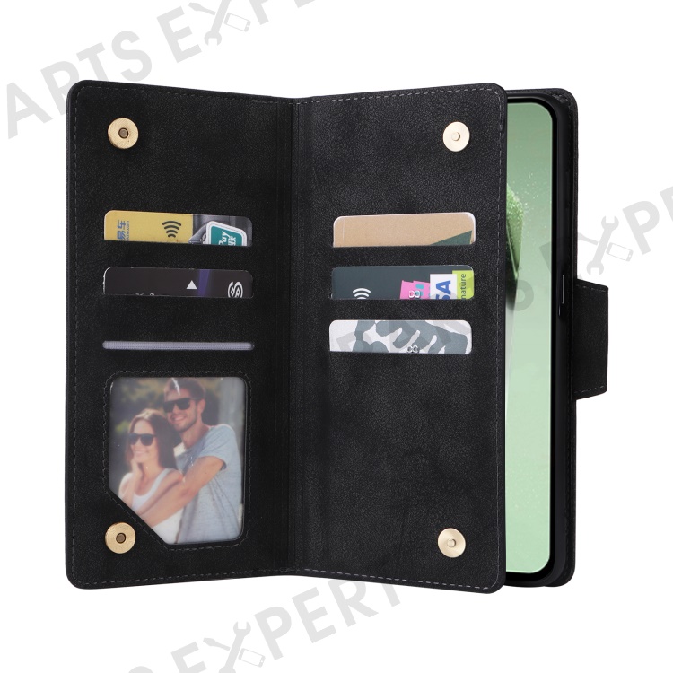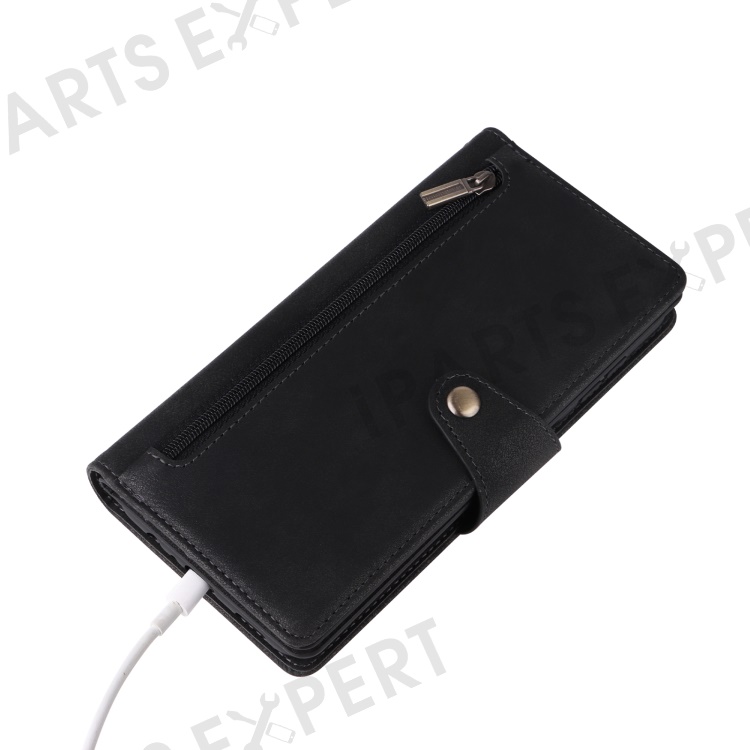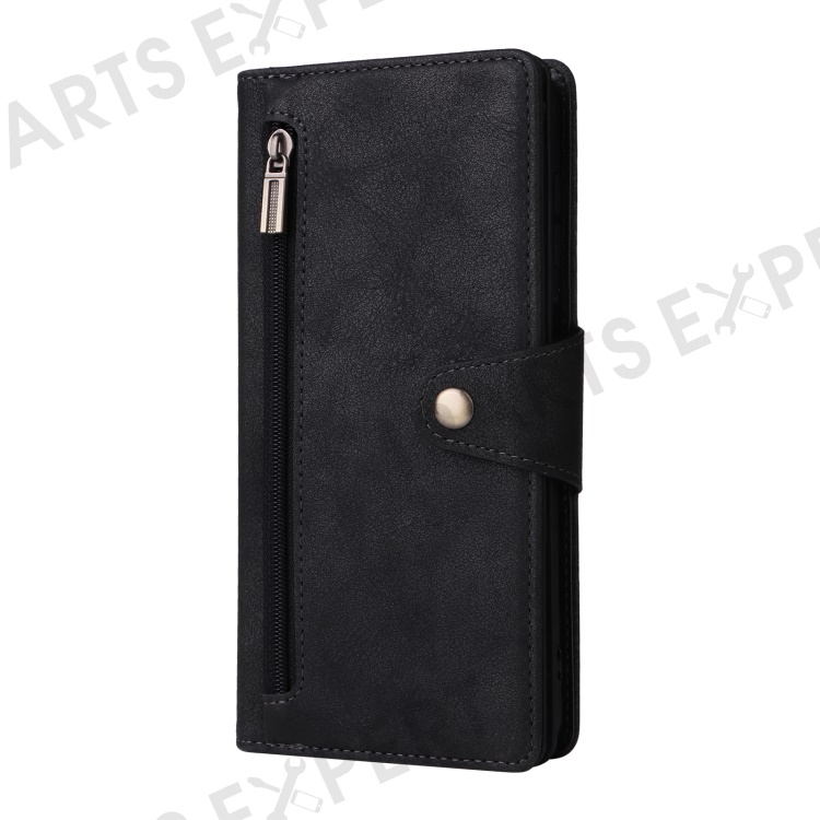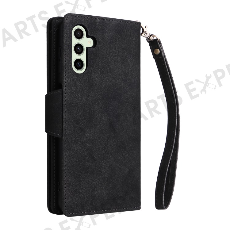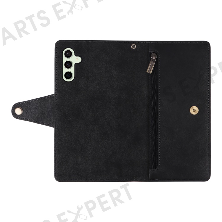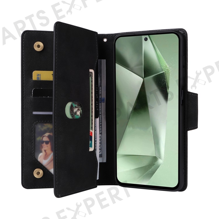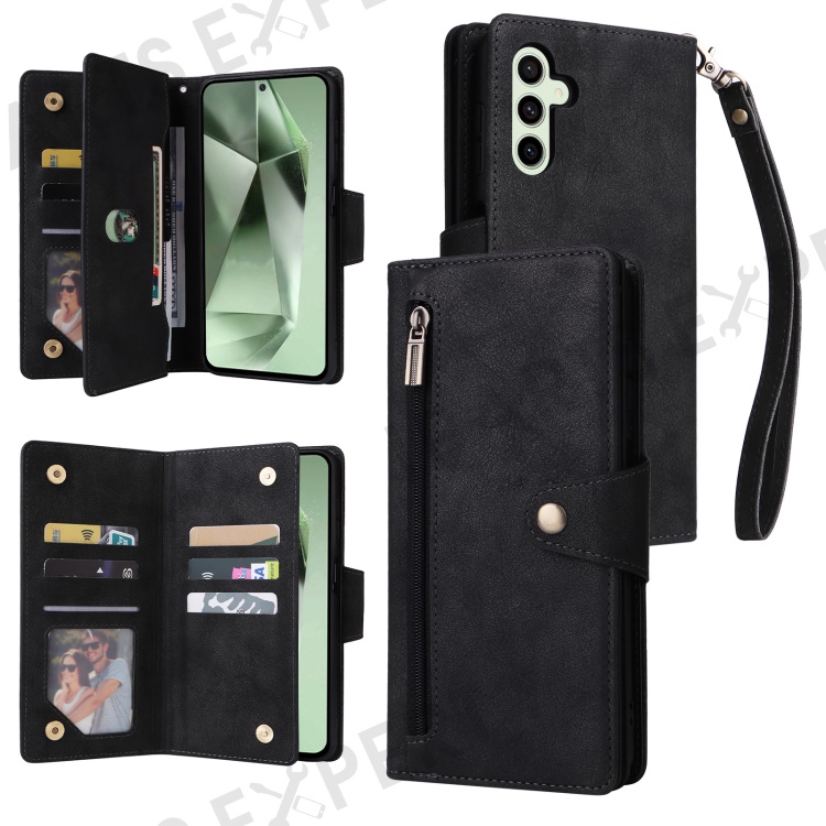 For Samsung Galaxy S24 FE Case Rivet Decor Zipper Pocket Leather Phone Cover - Black
