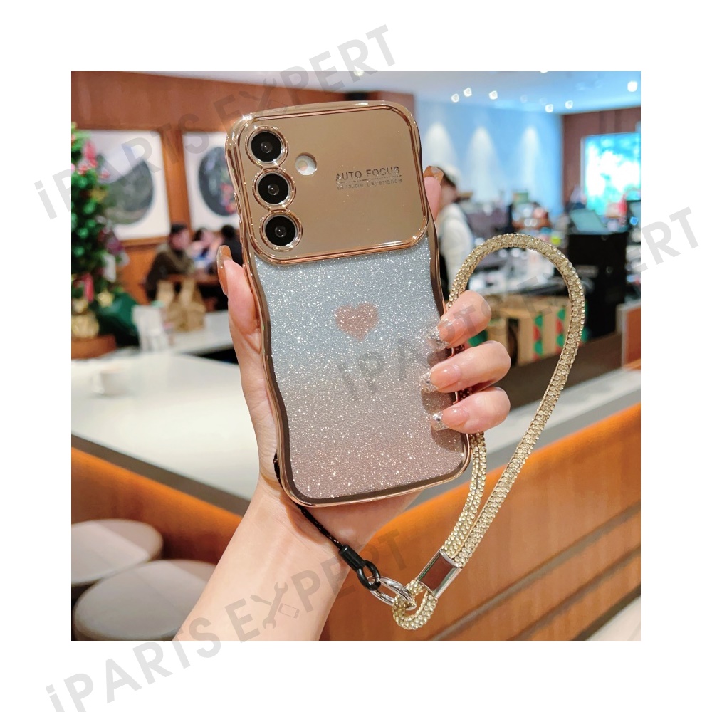 For Samsung Galaxy S24 FE Case with Strap Electroplating TPU Phone Cover Love Heart Gradient Glitter - Gold