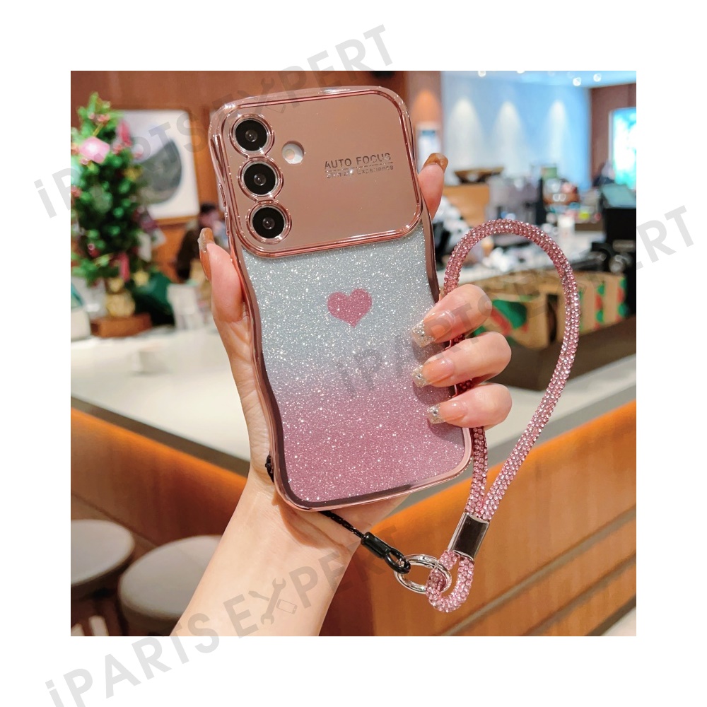 For Samsung Galaxy S24 FE Case with Strap Electroplating TPU Phone Cover Love Heart Gradient Glitter - Rose Pink