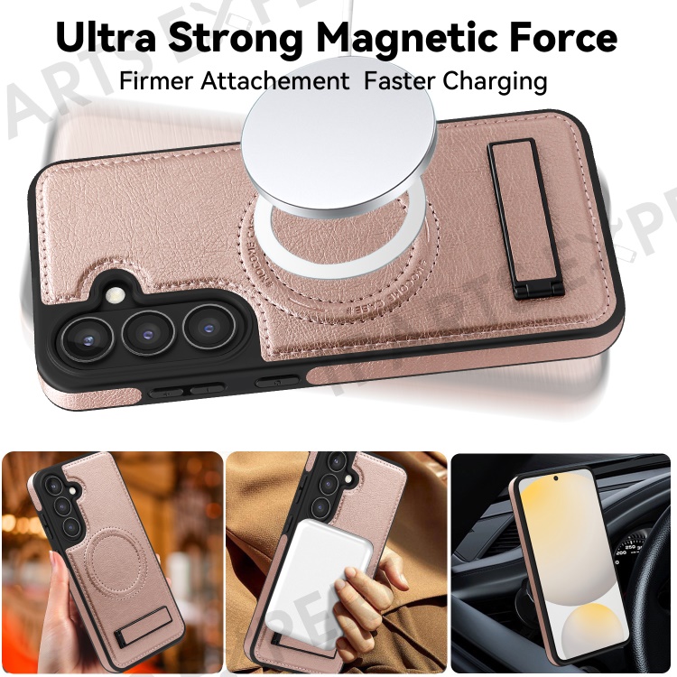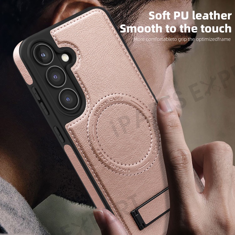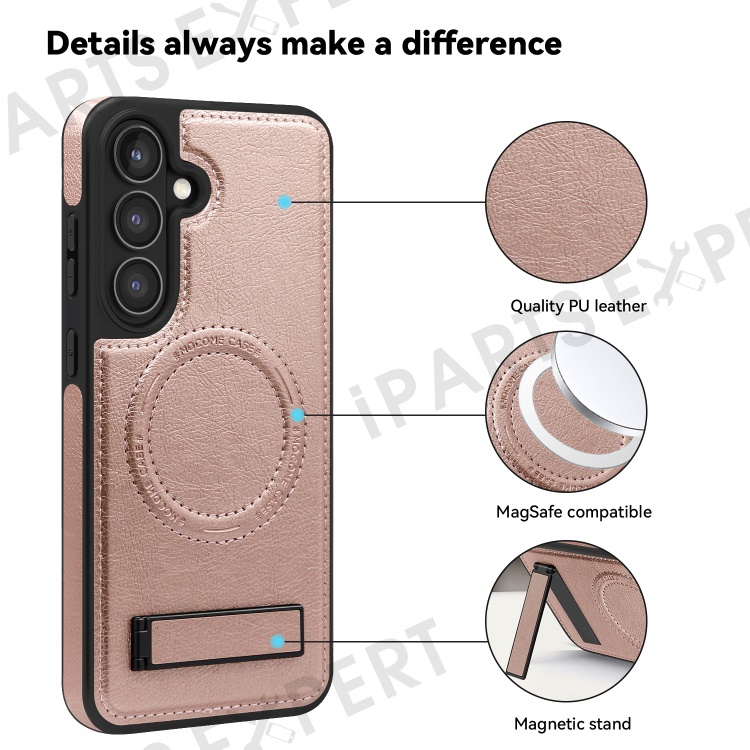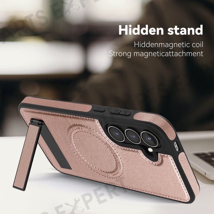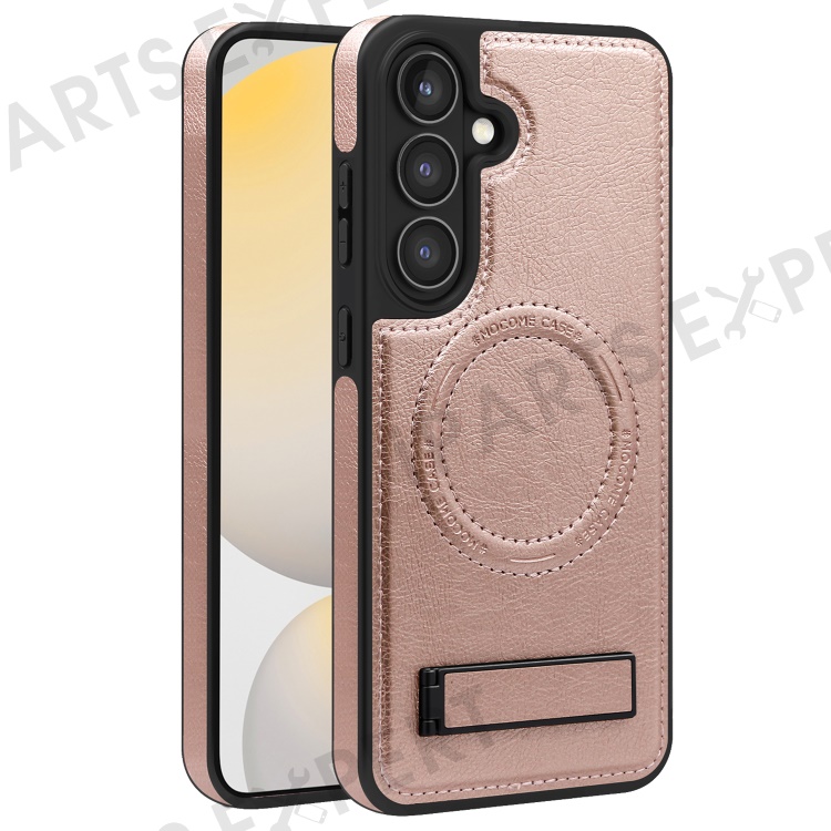 For Samsung Galaxy S24 FE Magnetic Case with Folded Kickstand PC Silicone Leather Phone Back Cover - Rose Gold