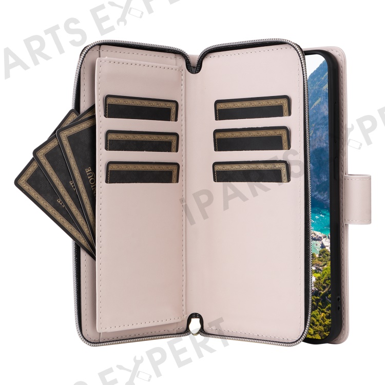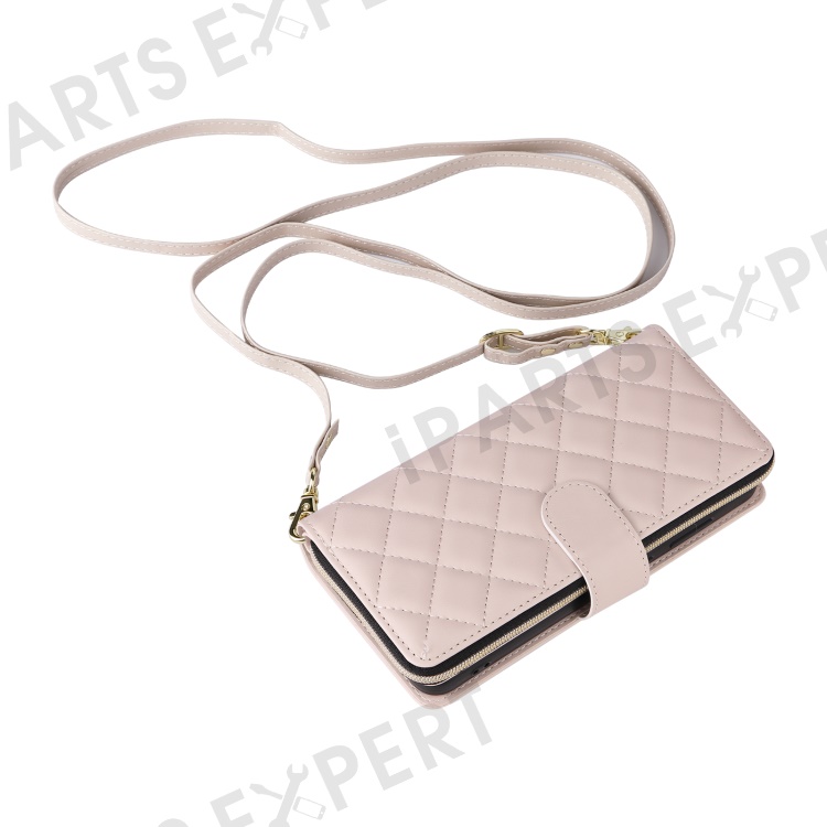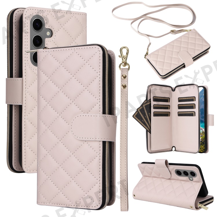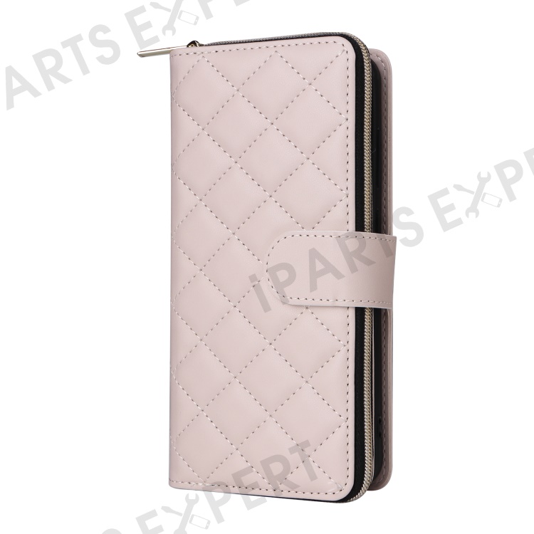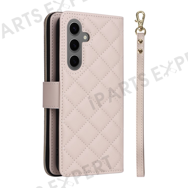 For Samsung Galaxy S24 Phone Case Leather Flip Cover with Rhombus Zipper Pocket - Beige