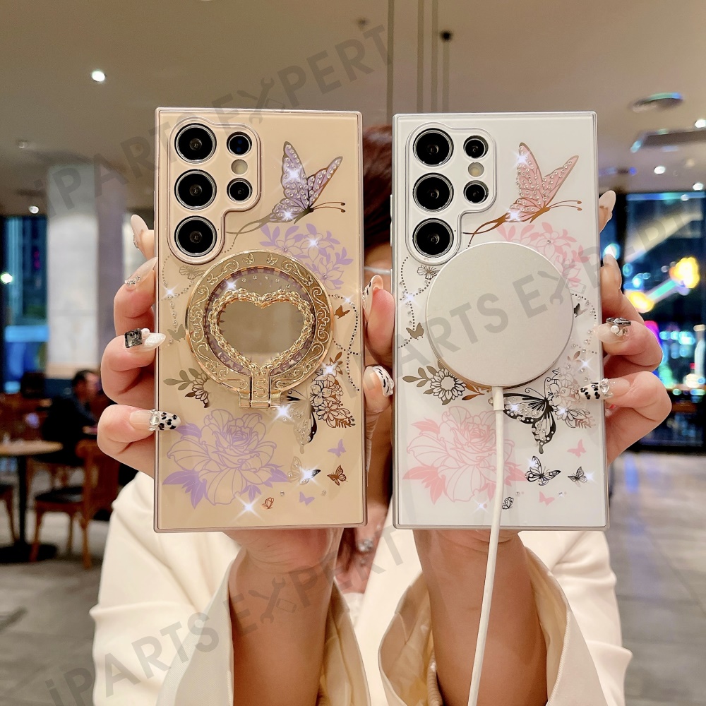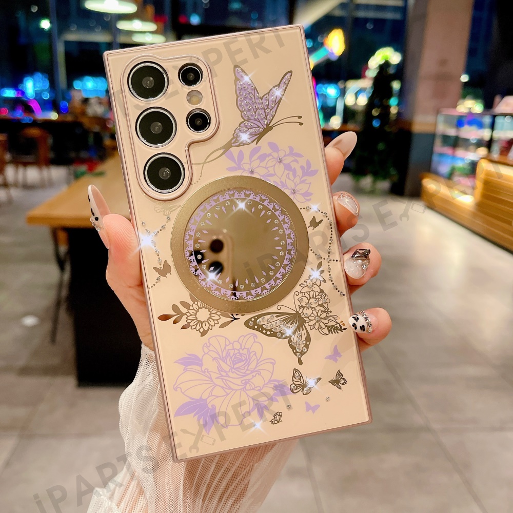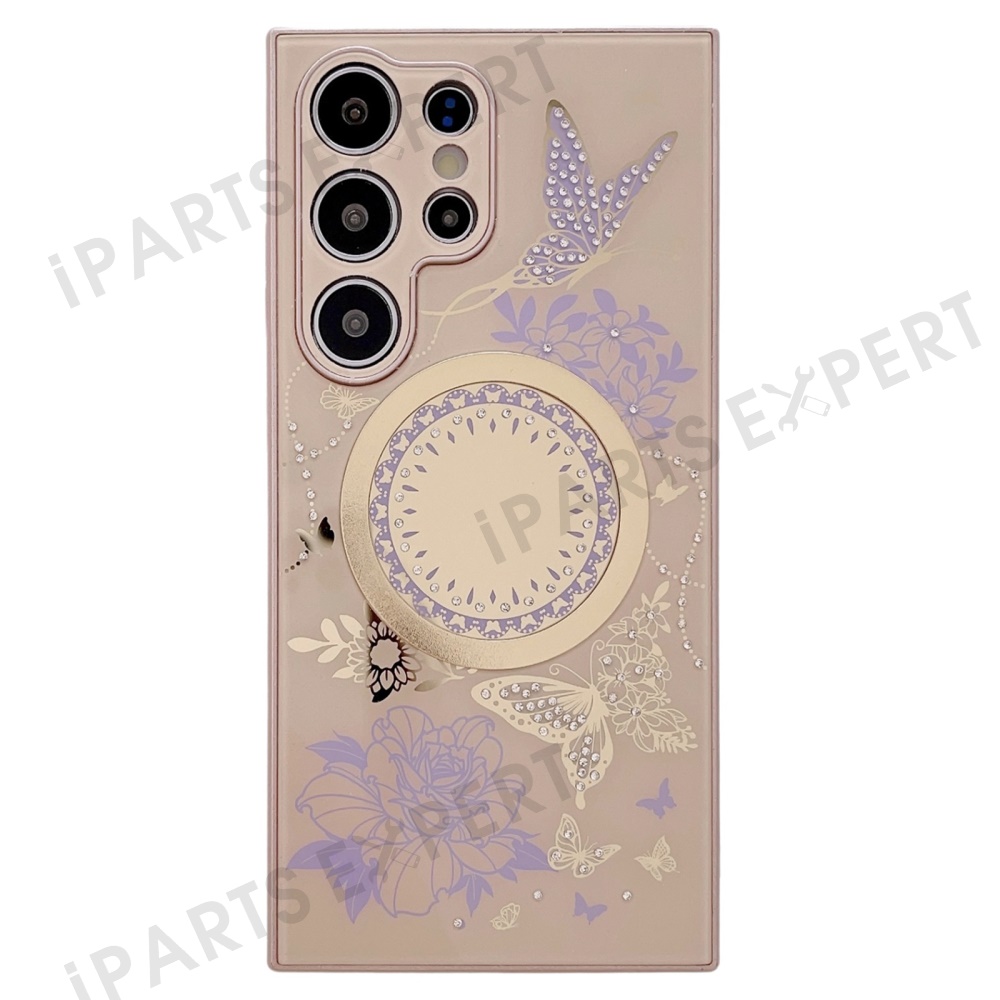 For Samsung Galaxy S24 Ultra Magnetic Case TPU + PC Phone Cover Flower Butterfly Pattern - Brown / Purple