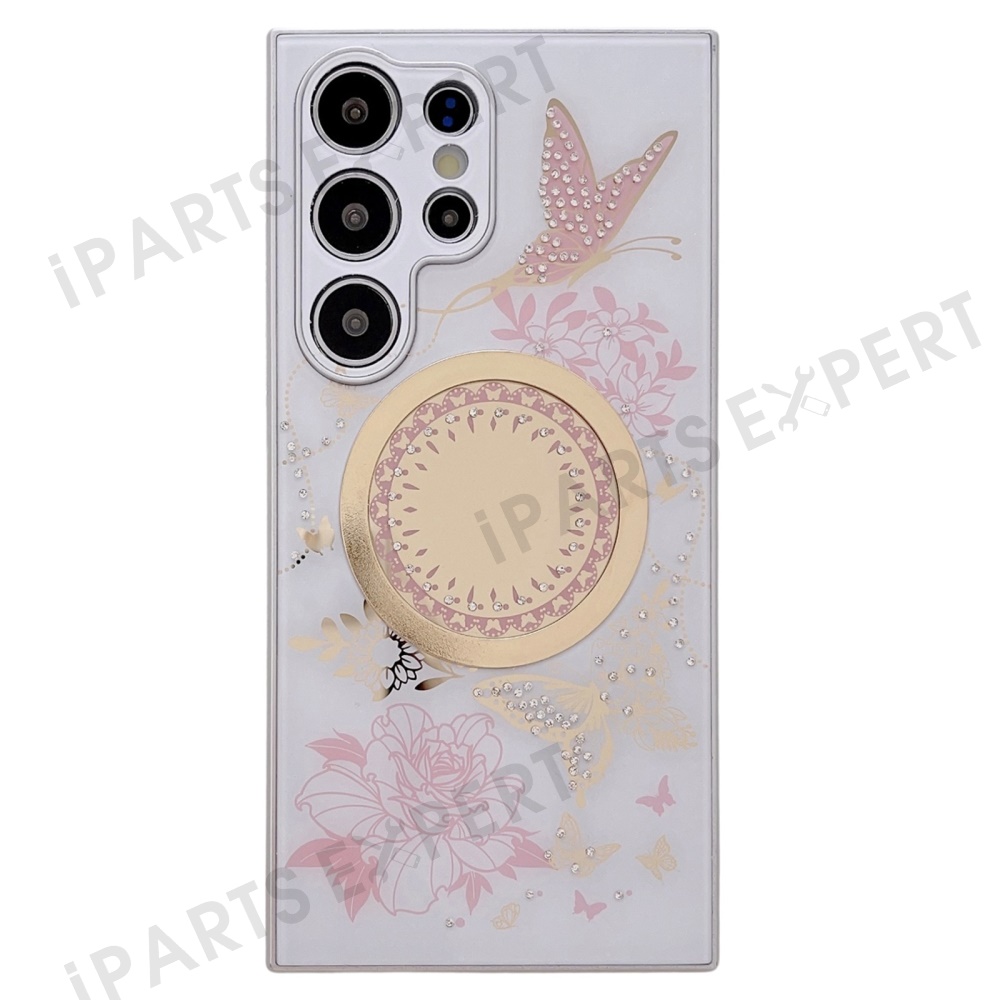 For Samsung Galaxy S24 Ultra Magnetic Case TPU + PC Phone Cover Flower Butterfly Pattern - White / Pink
