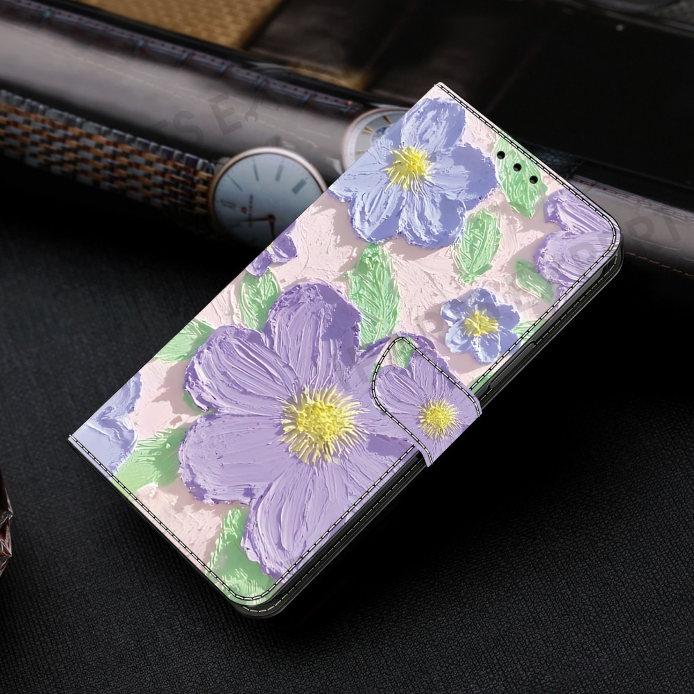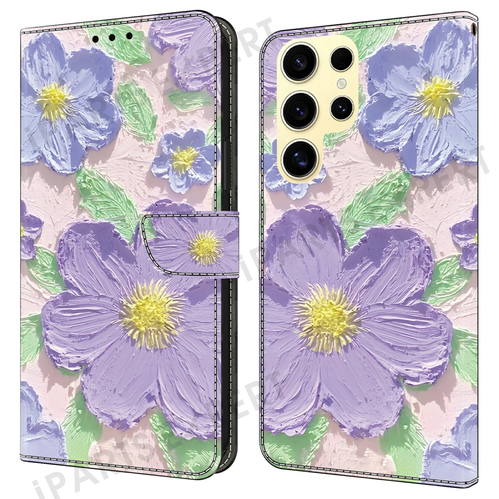 For Samsung Galaxy S24 Ultra Case Pattern Printing Anti-Drop Leather Flip Wallet Phone Cover - Oil Painting Purple Flowers