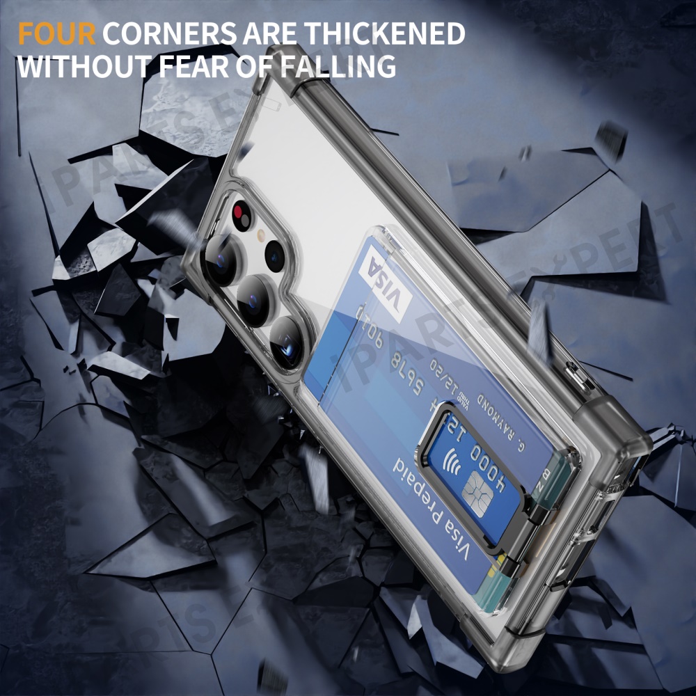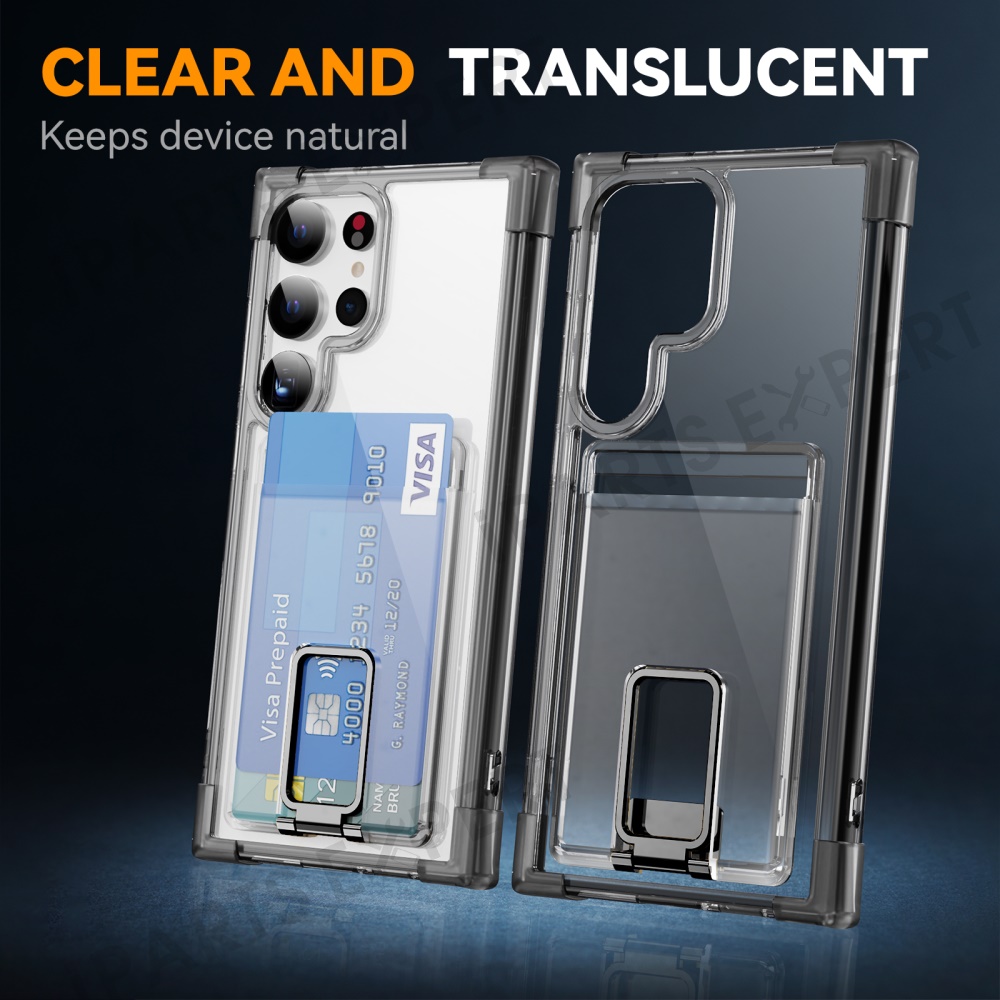 For Samsung Galaxy S24 Ultra Case Reinforced Corners TPU + Acrylic Phone Cover with Kickstand Card Holder - Transparent Black