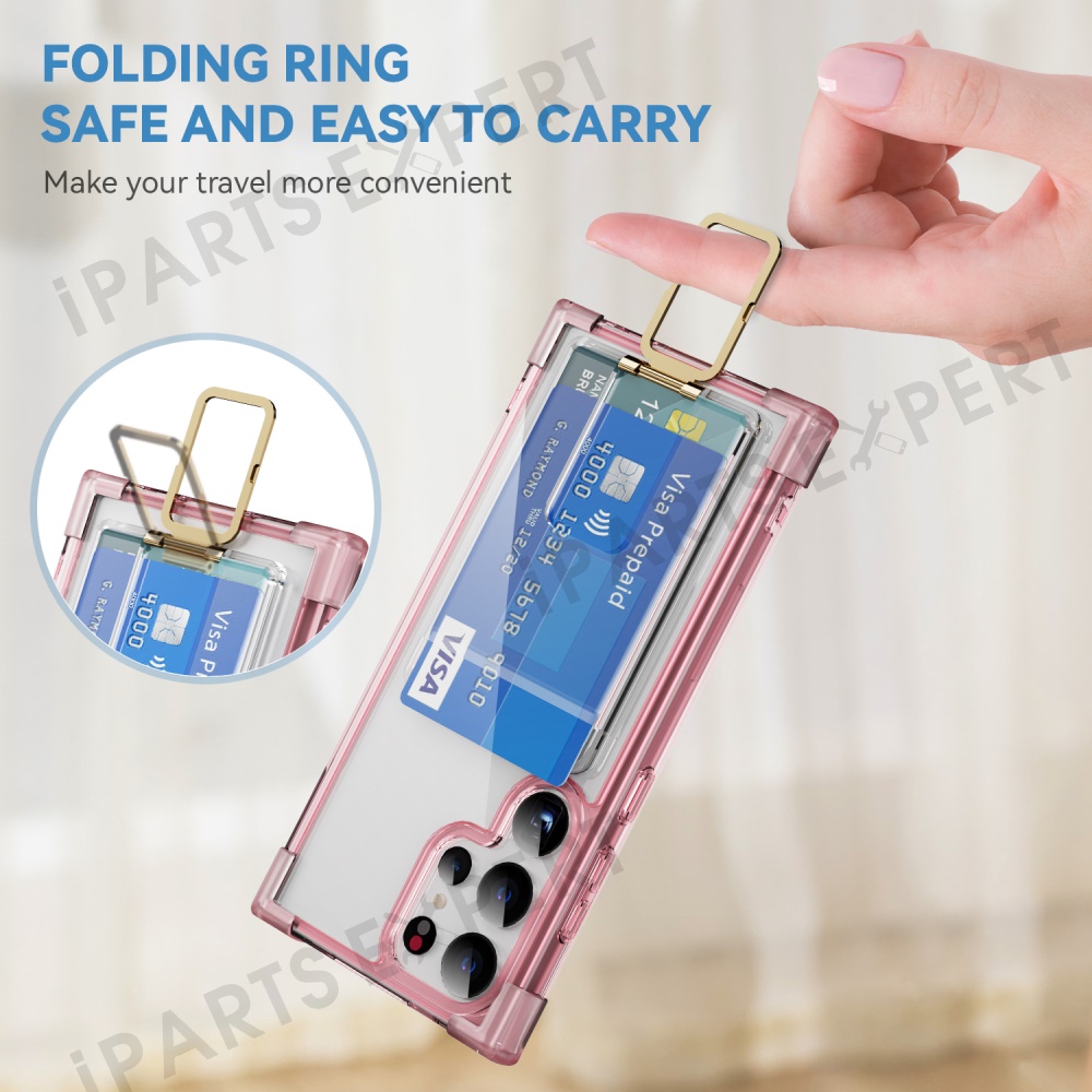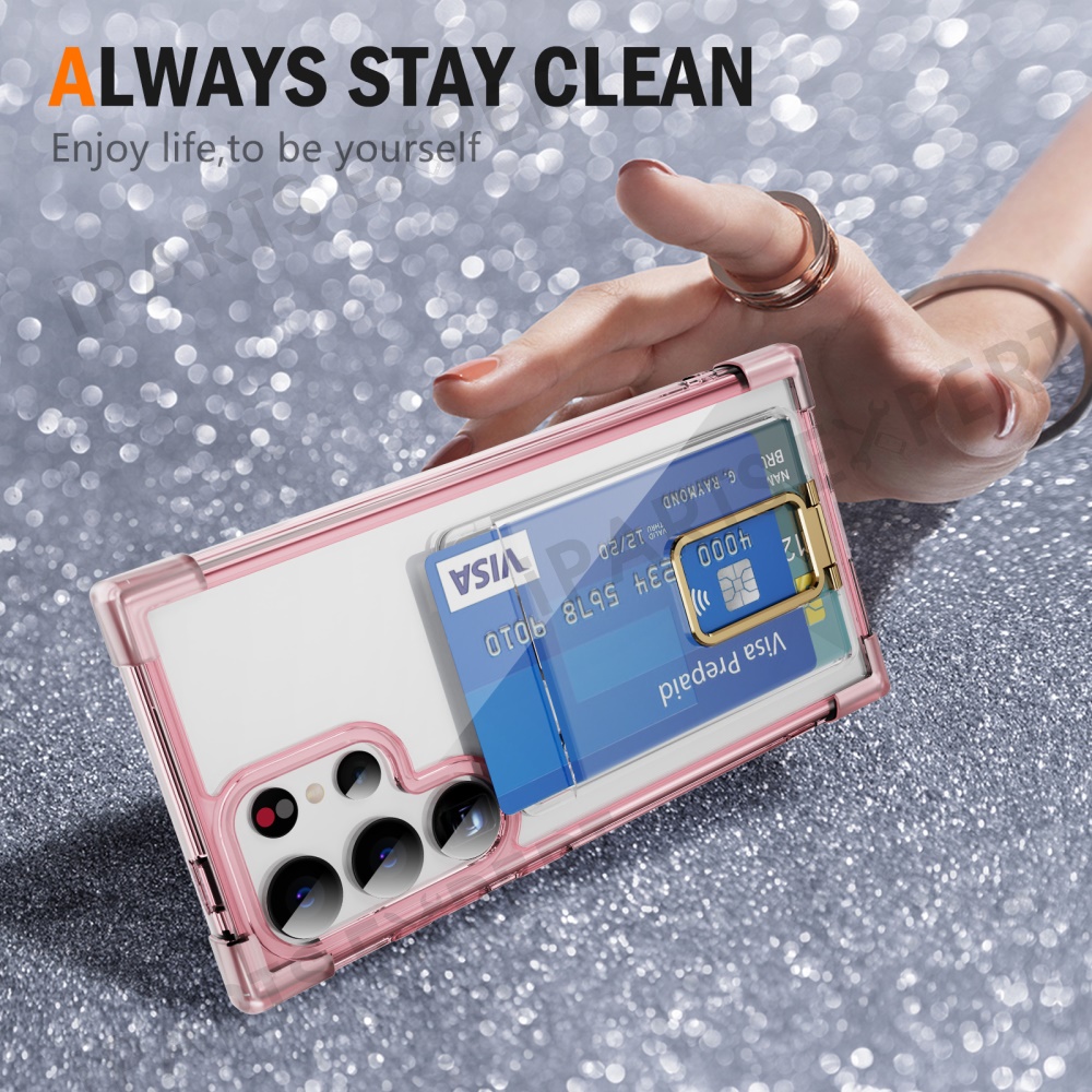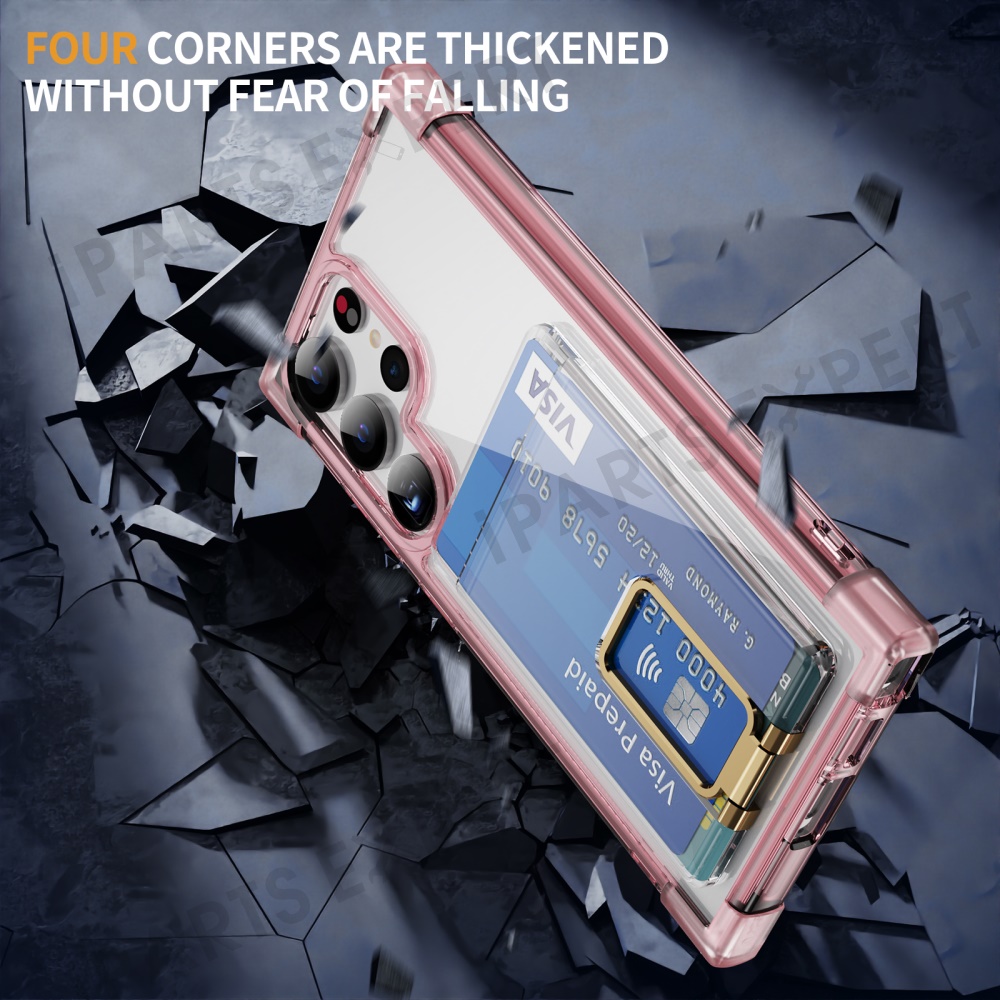 For Samsung Galaxy S24 Ultra Case Reinforced Corners TPU + Acrylic Phone Cover with Kickstand Card Holder - Transparent Pink