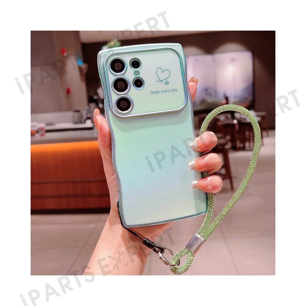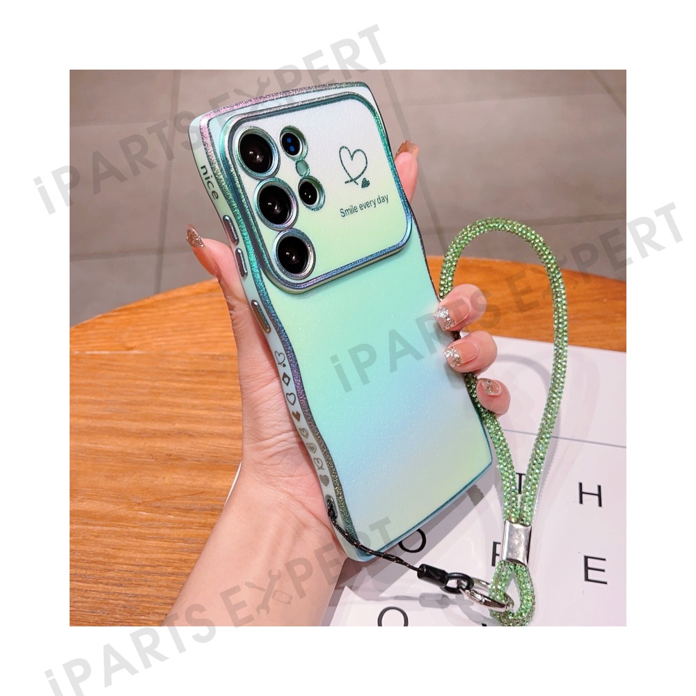 For Samsung Galaxy S24 Ultra Case with Strap TPU Phone Back Cover Dazzling Design Curly Shape Love Heart - Colorful Green