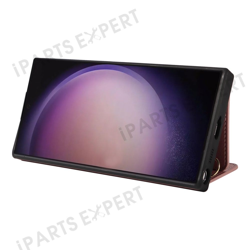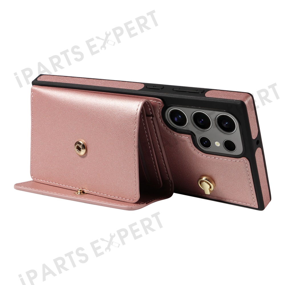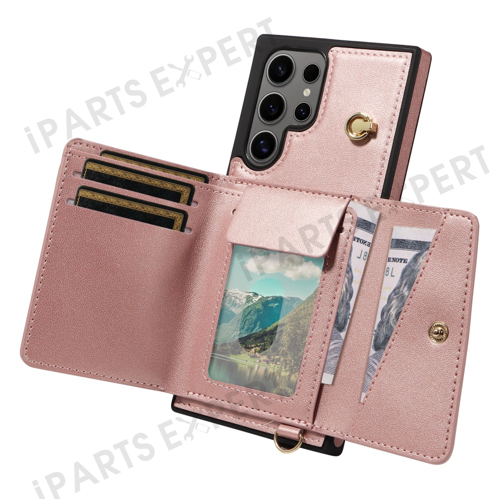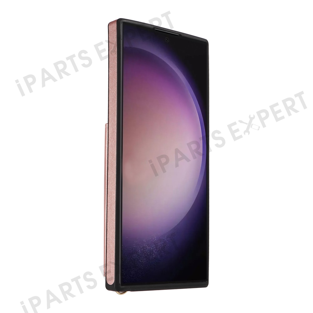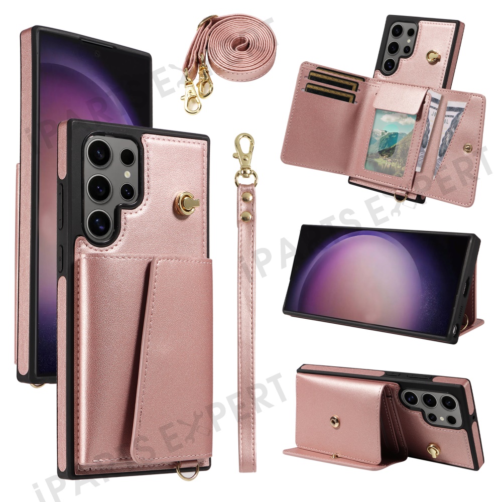 For Samsung Galaxy S24 Ultra Crossbody Phone Case Card Holder Kickstand Leather Coated TPU Mobile Cover - Rose Gold