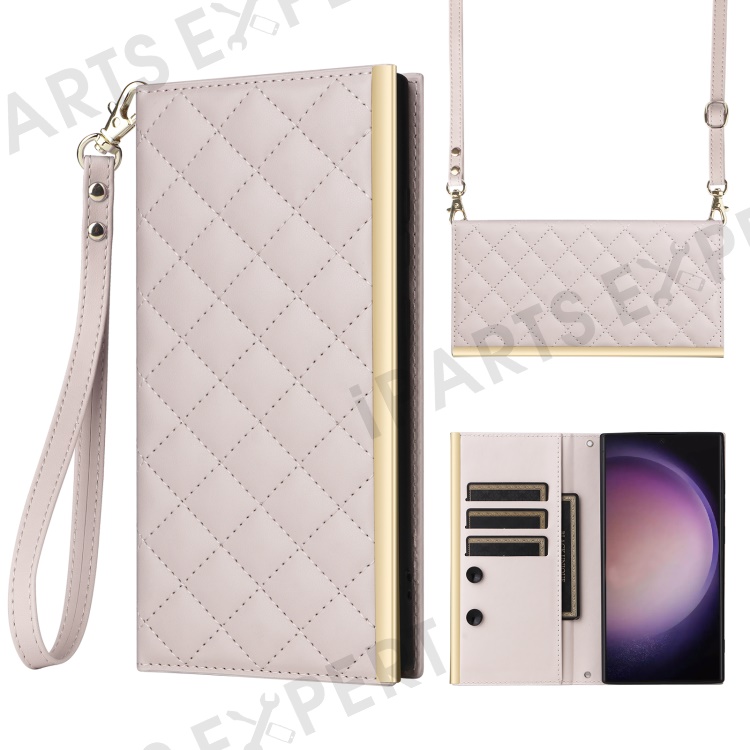 For Samsung Galaxy S24 Ultra Suction Cup PU Leather Phone Case Stand Wallet Phone Cover Shoulder Bag - Beige