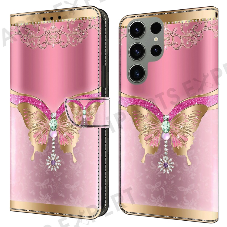 For Samsung Galaxy S24 Ultra Wallet Case PU Leather 3D Pattern Printing Stand Cover - Pink / Gold Butterfly