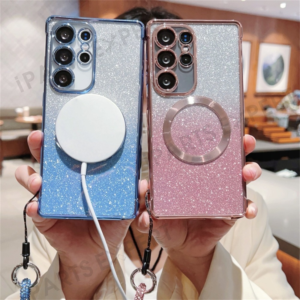 For Samsung Galaxy S25+ Magnetic Case Electroplated Gradient Glitter Phone Cover with Lanyard - Black