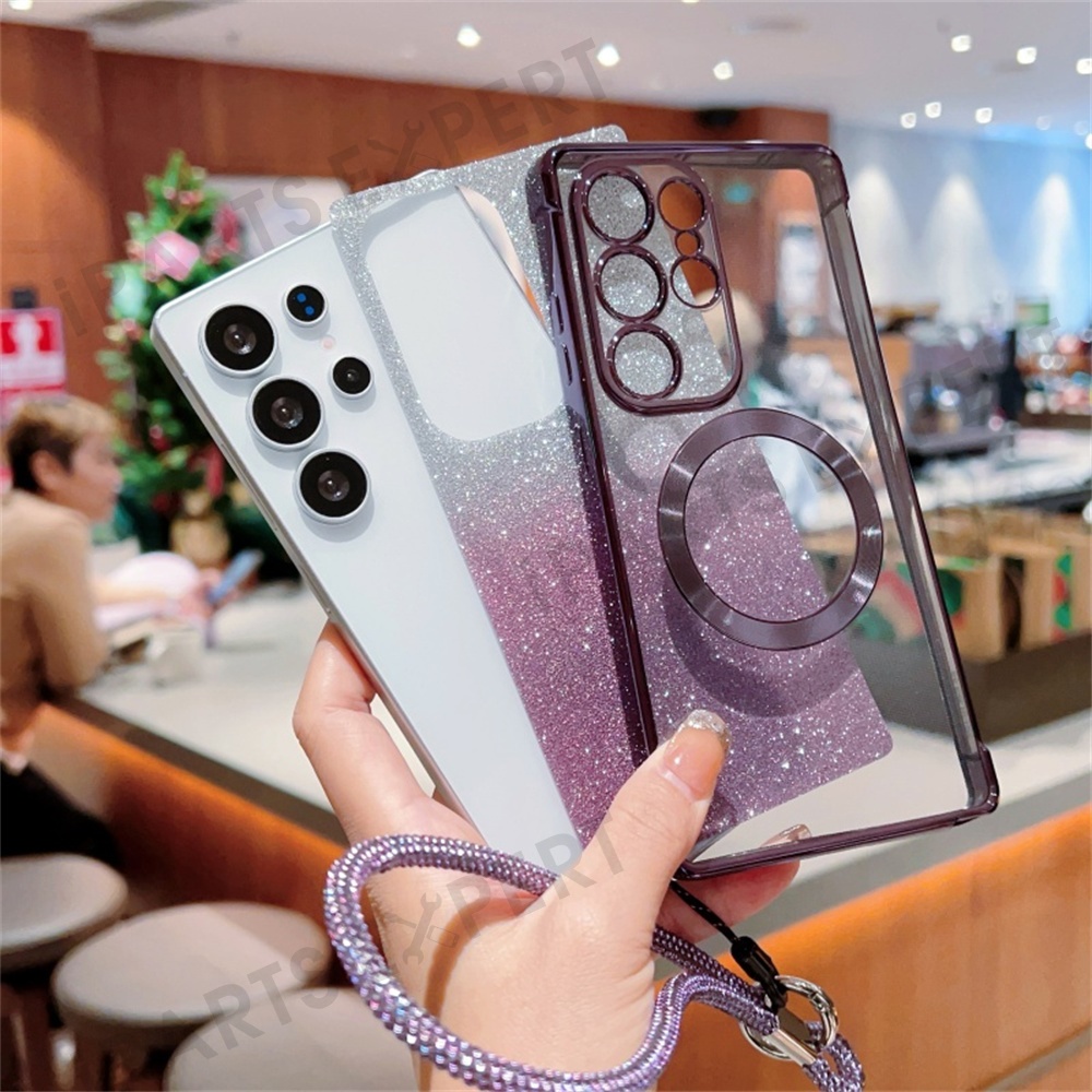 For Samsung Galaxy S25+ Magnetic Case Electroplated Gradient Glitter Phone Cover with Lanyard - Blue