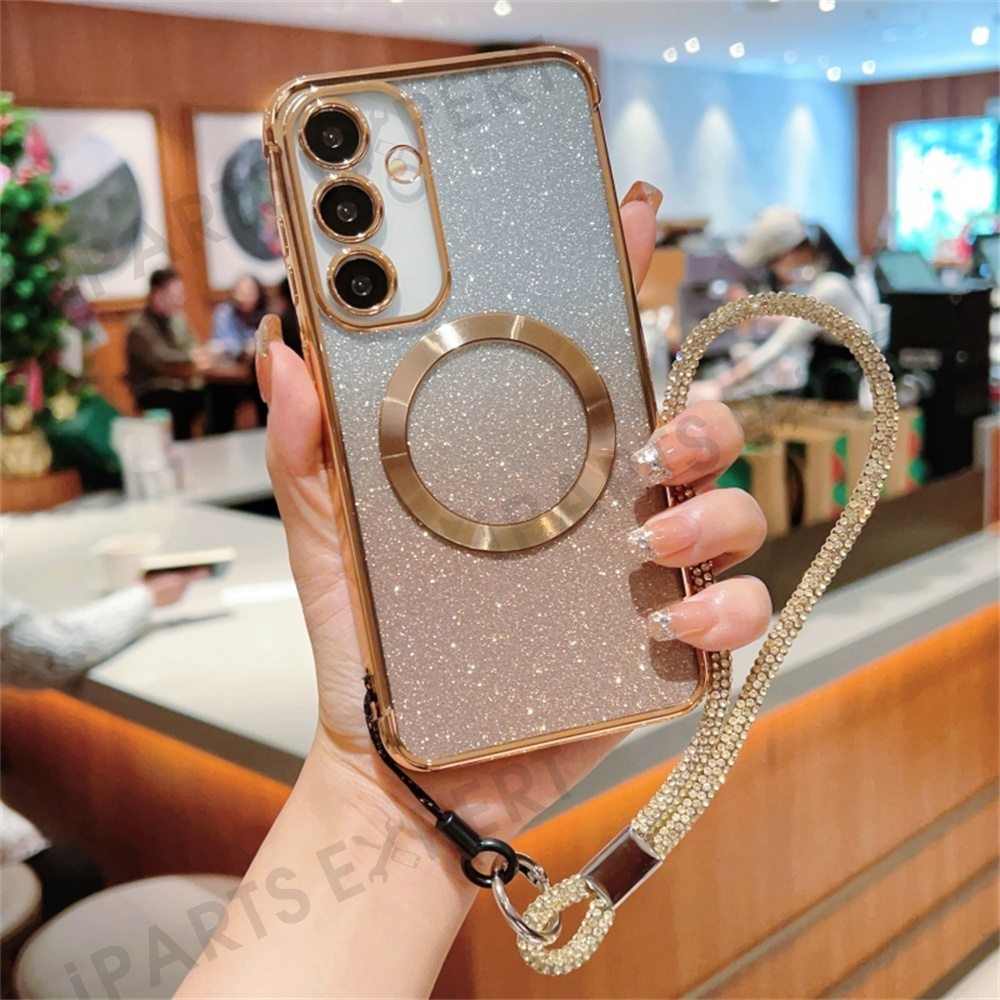 For Samsung Galaxy S25 Magnetic Case Electroplated Gradient Glitter Phone Cover with Lanyard - Gold