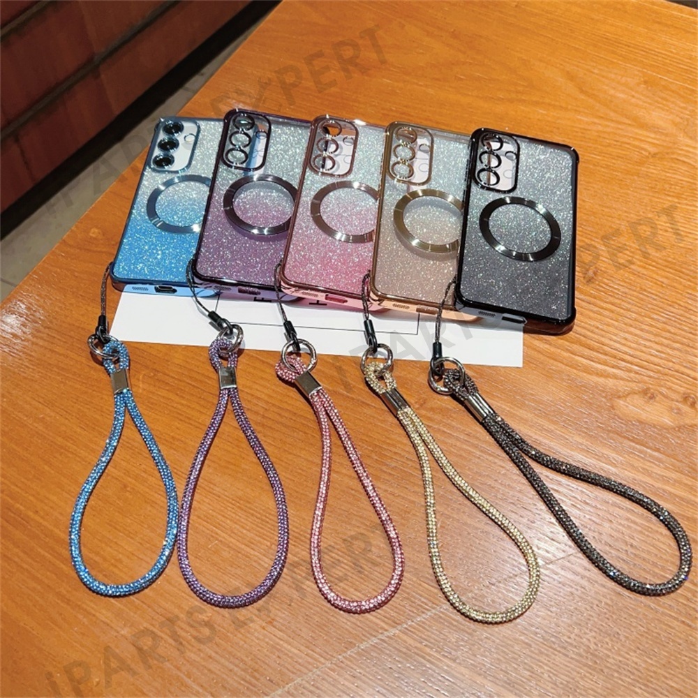 For Samsung Galaxy S25+ Magnetic Case Electroplated Gradient Glitter Phone Cover with Lanyard - Gold