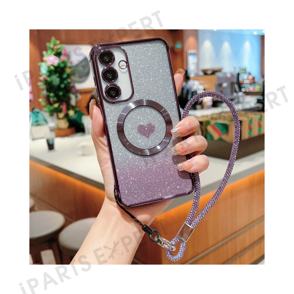 For Samsung Galaxy S25 Magnetic Case TPU Phone Cover with Strap Heart Gradient Sparkle - Dark Purple