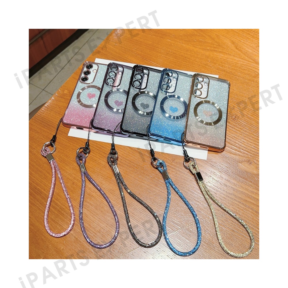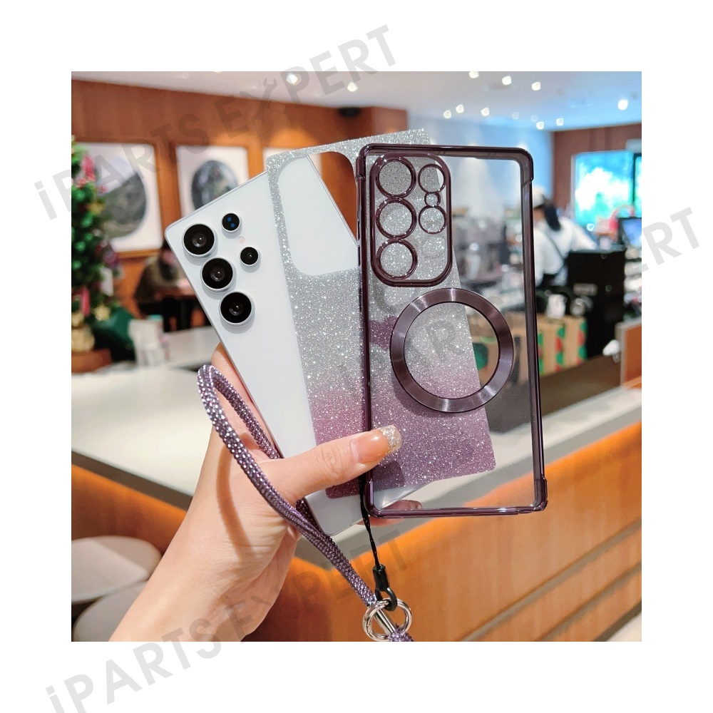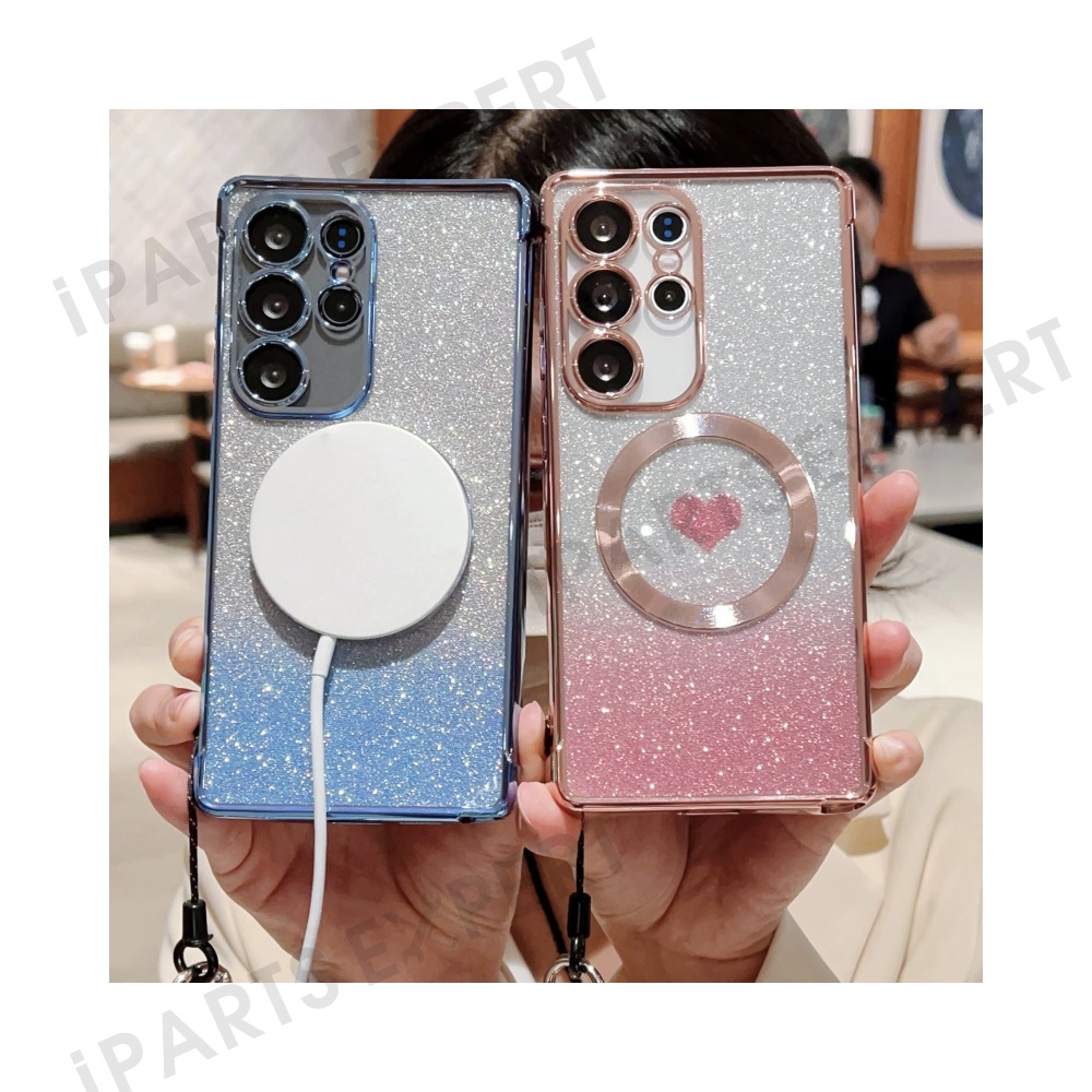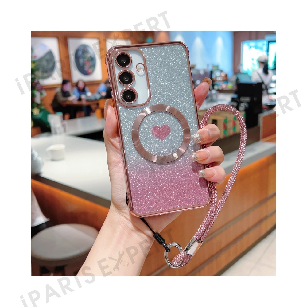 For Samsung Galaxy S25 Magnetic Case TPU Phone Cover with Strap Heart Gradient Sparkle - Rose Pink