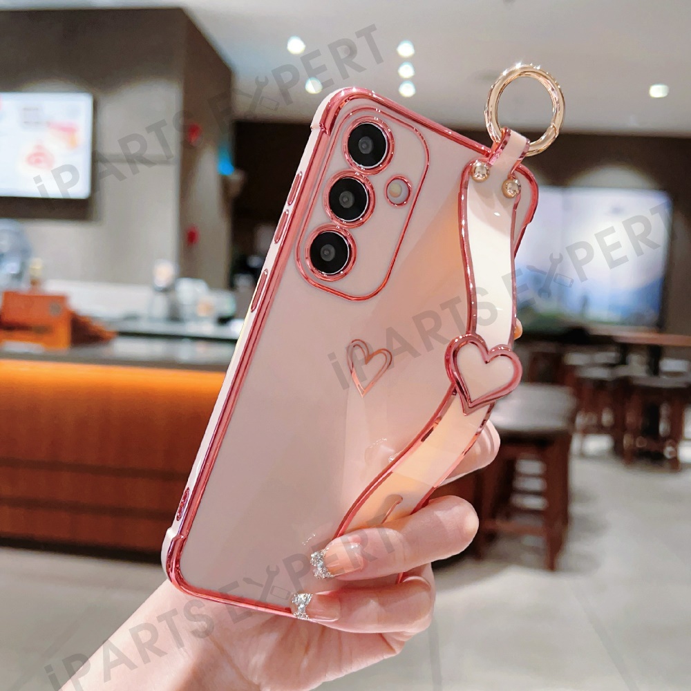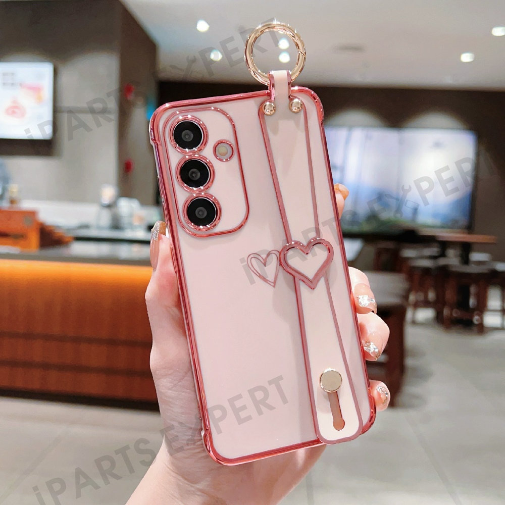 For Samsung Galaxy S25 Case Electroplated Heart Pattern TPU Phone Back Cover with Wristband Kickstand - Pink