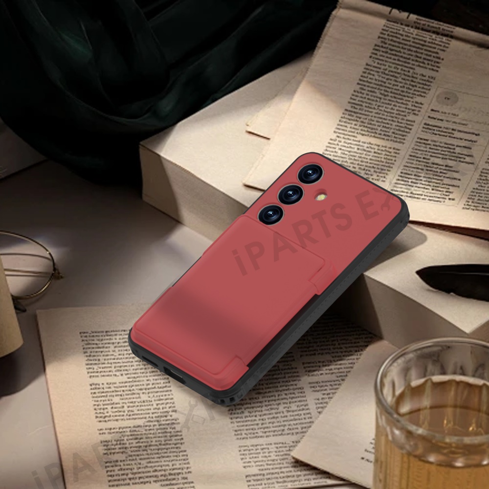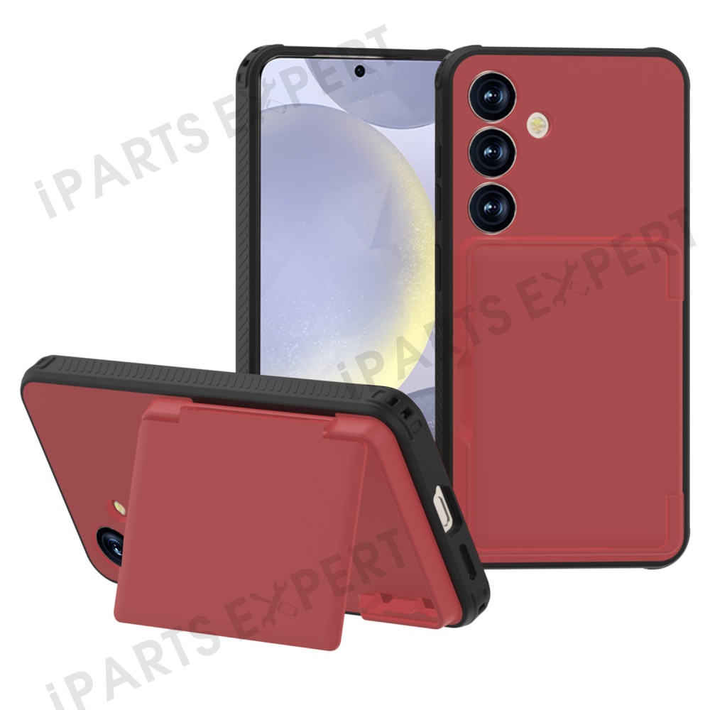 For Samsung Galaxy S25+ Case with Card Holder Hidden Mirror PC + TPU Kickstand Phone Cover - Red