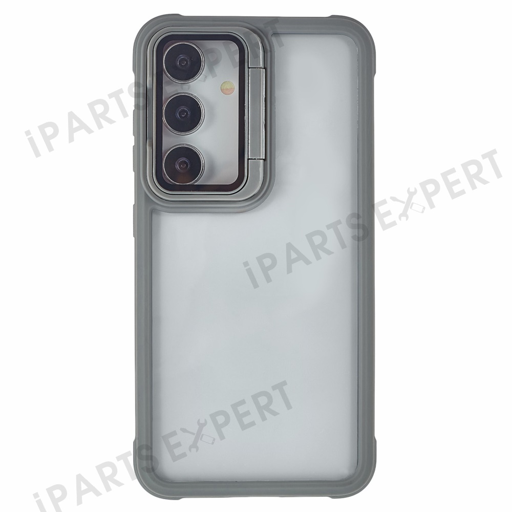 For Samsung Galaxy S25 Case with Lens Cover Kickstand PC+TPU Clear Back Phone Cover - Grey