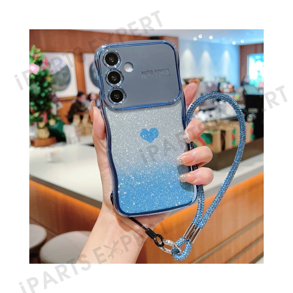 For Samsung Galaxy S25 Case with Strap Electroplating TPU Phone Cover Love Heart Gradient Glitter - Blue