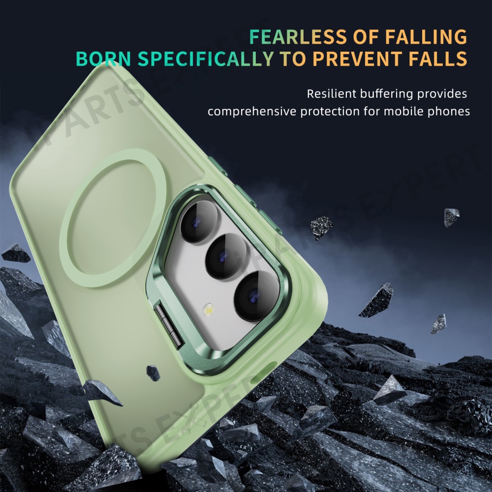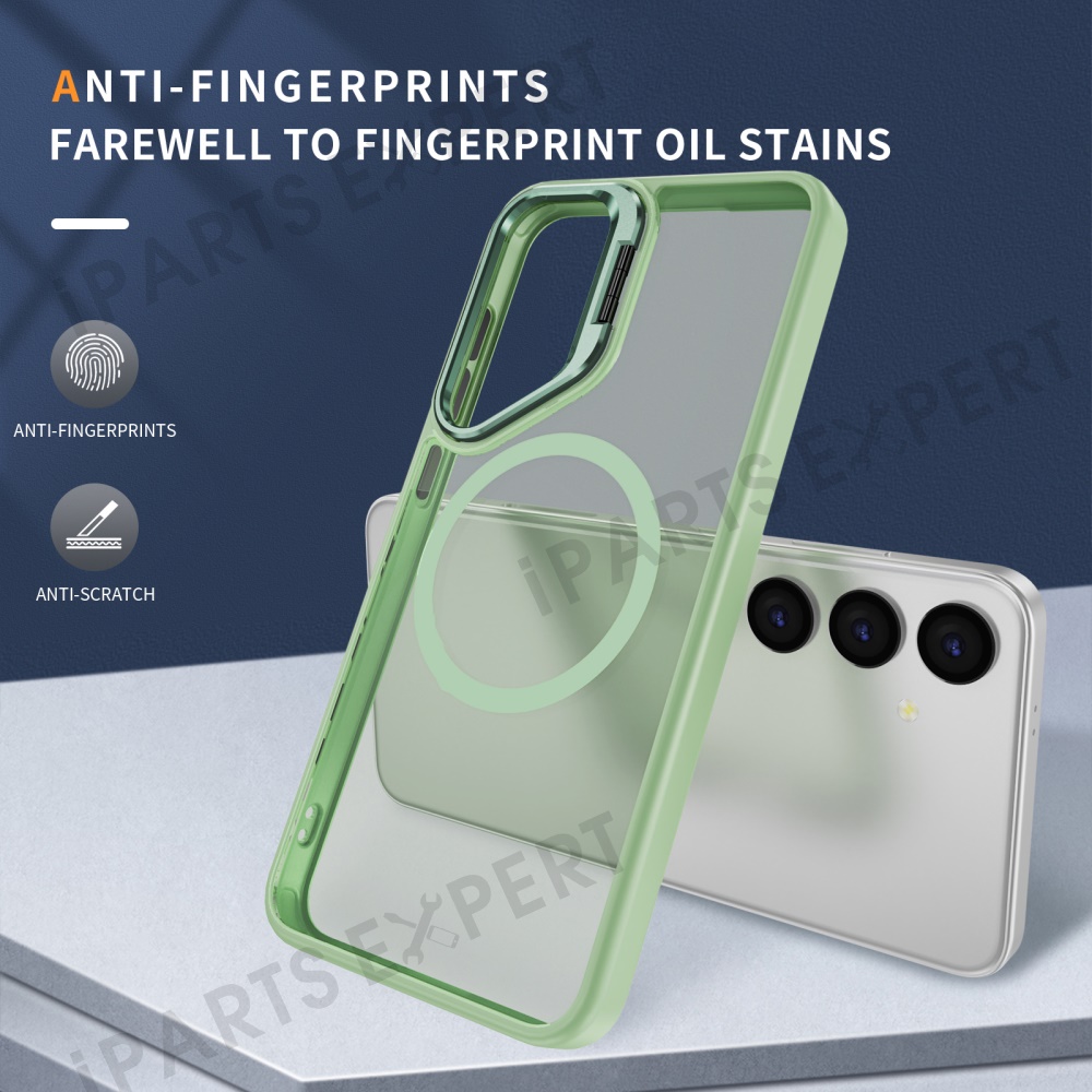 For Samsung Galaxy S25 Magnetic Case with Lens Kickstand Skin-Touch PC + TPU Phone Cover - Green