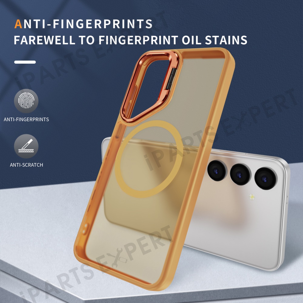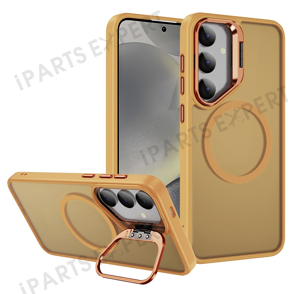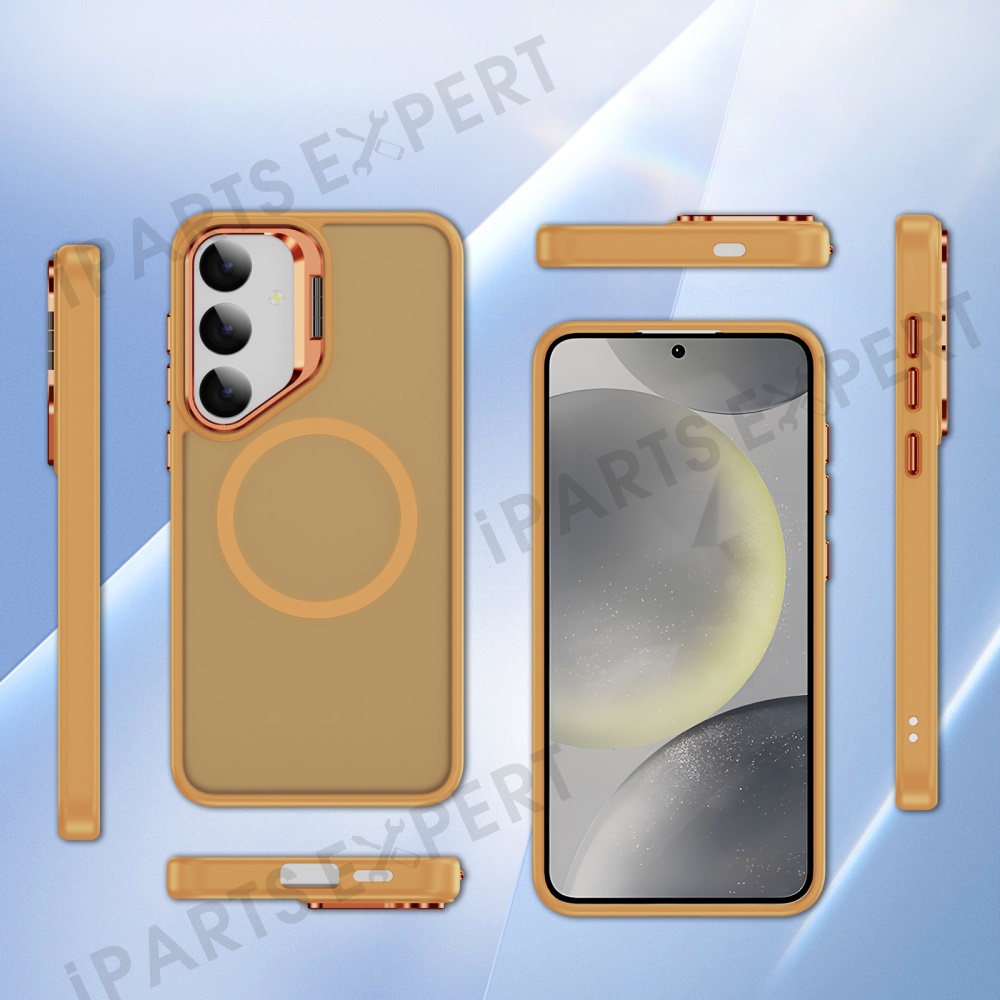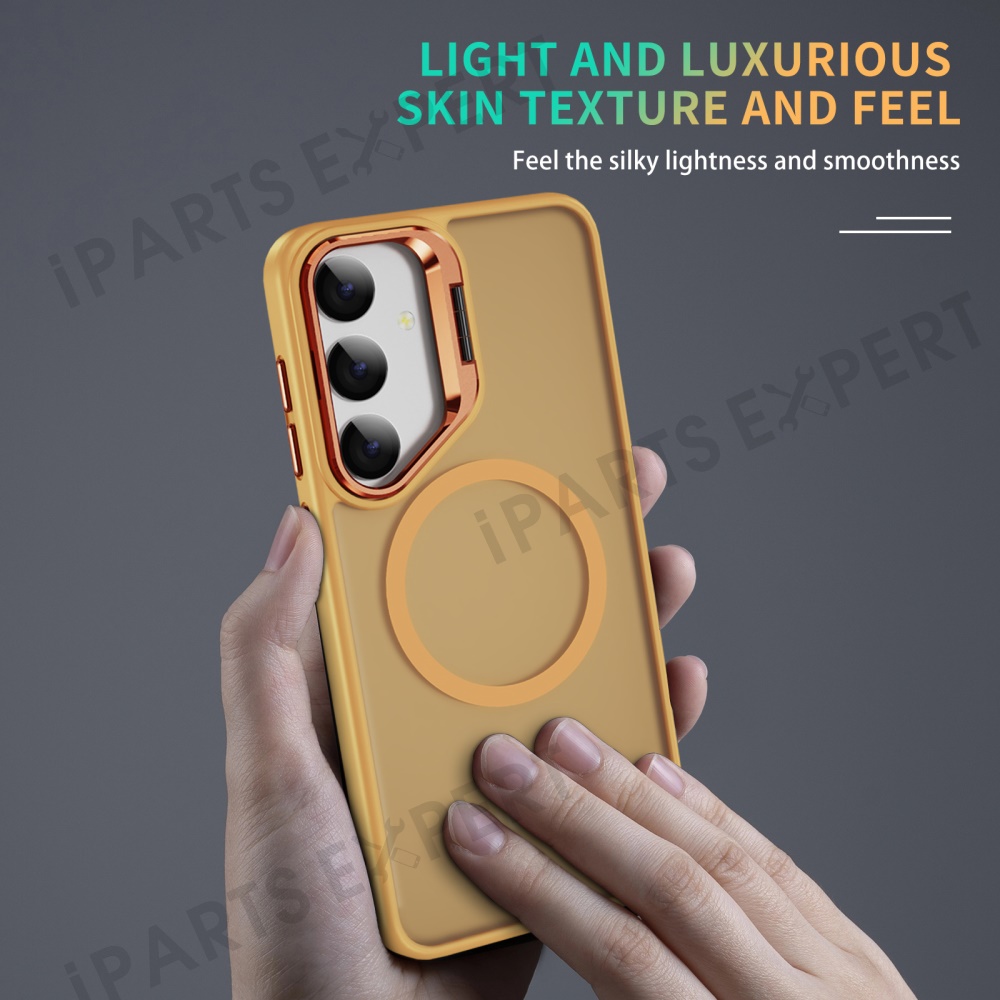 For Samsung Galaxy S25+ Magnetic Case with Lens Kickstand Skin-Touch PC + TPU Phone Cover - Orange