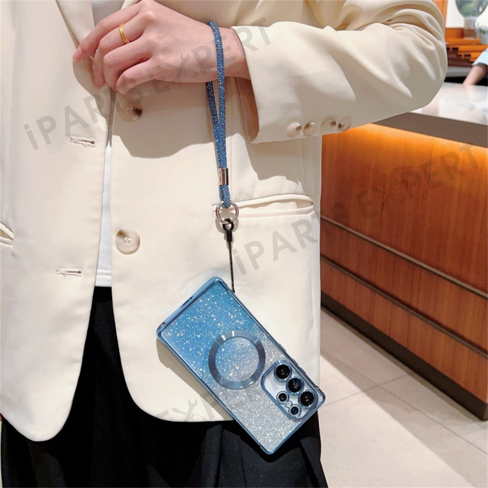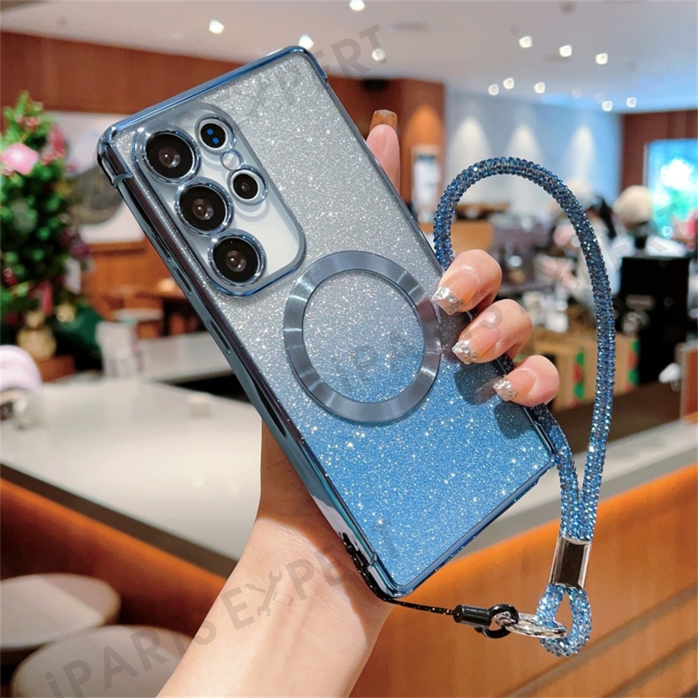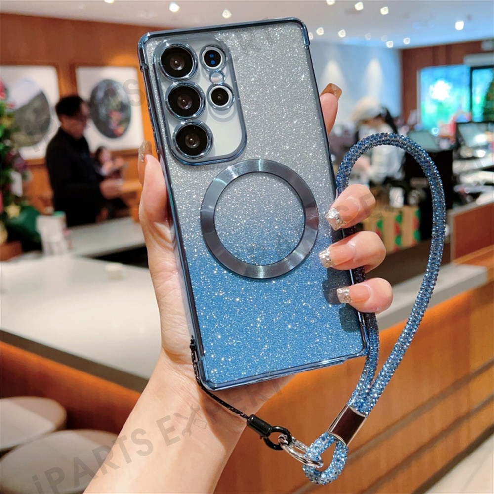 For Samsung Galaxy S25 Ultra Magnetic Case Electroplated Gradient Glitter Phone Cover with Lanyard - Blue