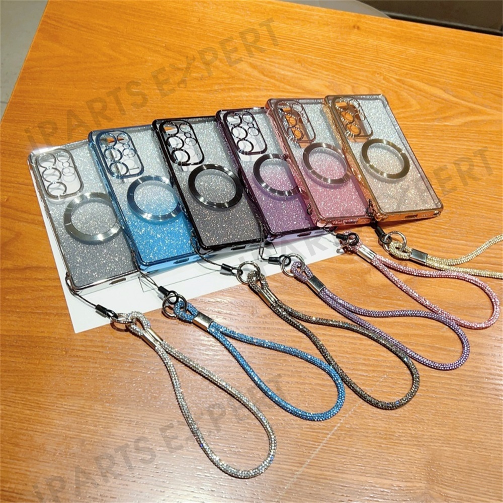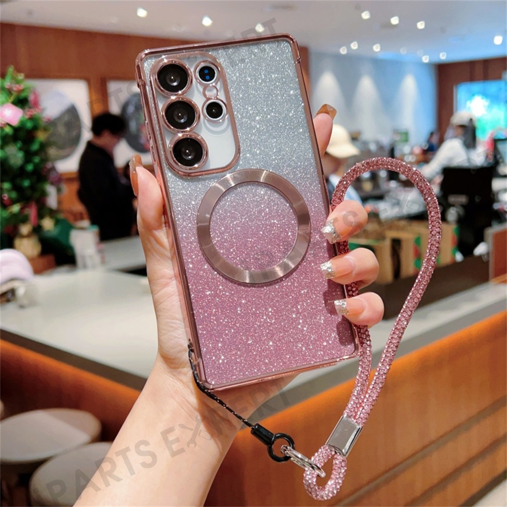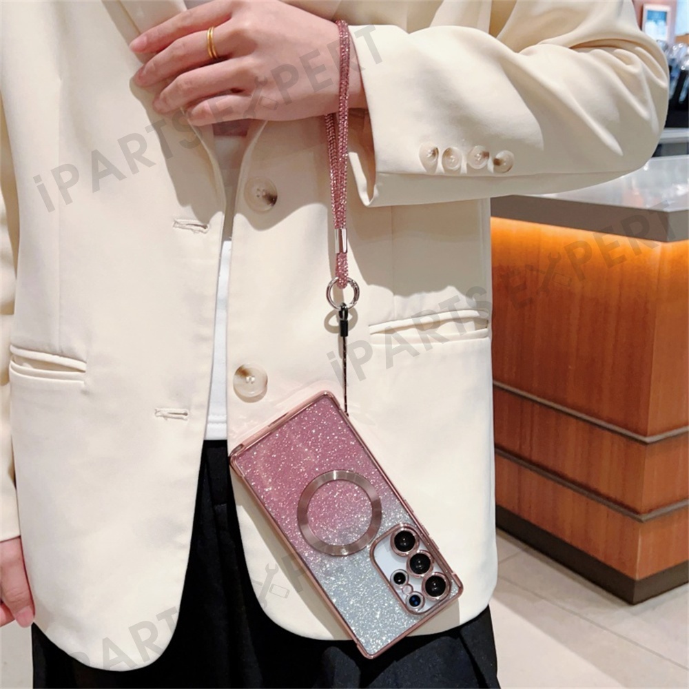 For Samsung Galaxy S25 Ultra Magnetic Case Electroplated Gradient Glitter Phone Cover with Lanyard - Rose Pink