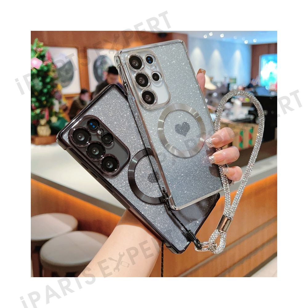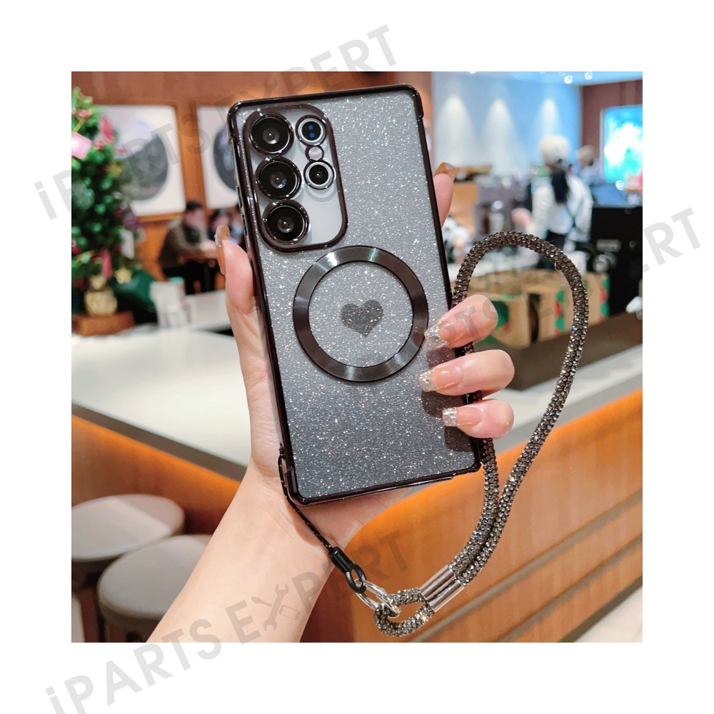 For Samsung Galaxy S25 Ultra Magnetic Case TPU Phone Cover with Strap Heart Gradient Sparkle - Black