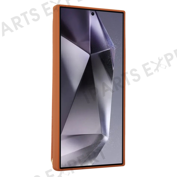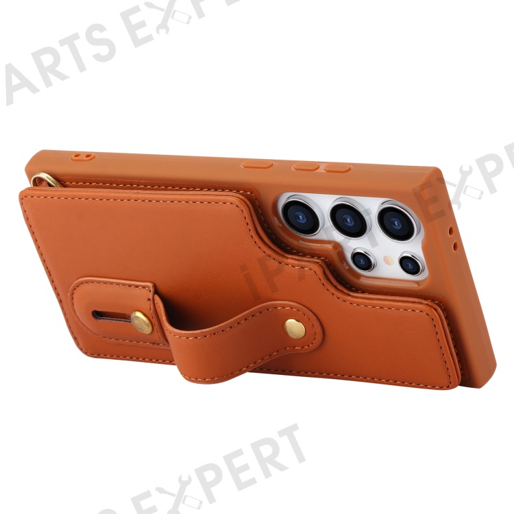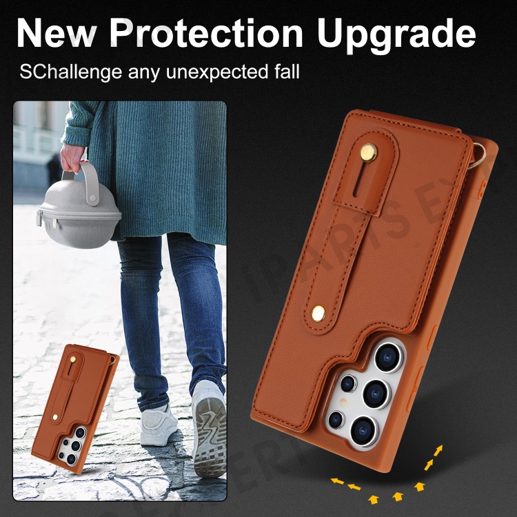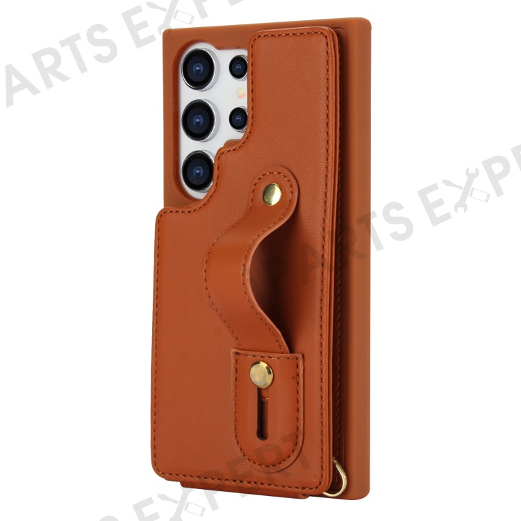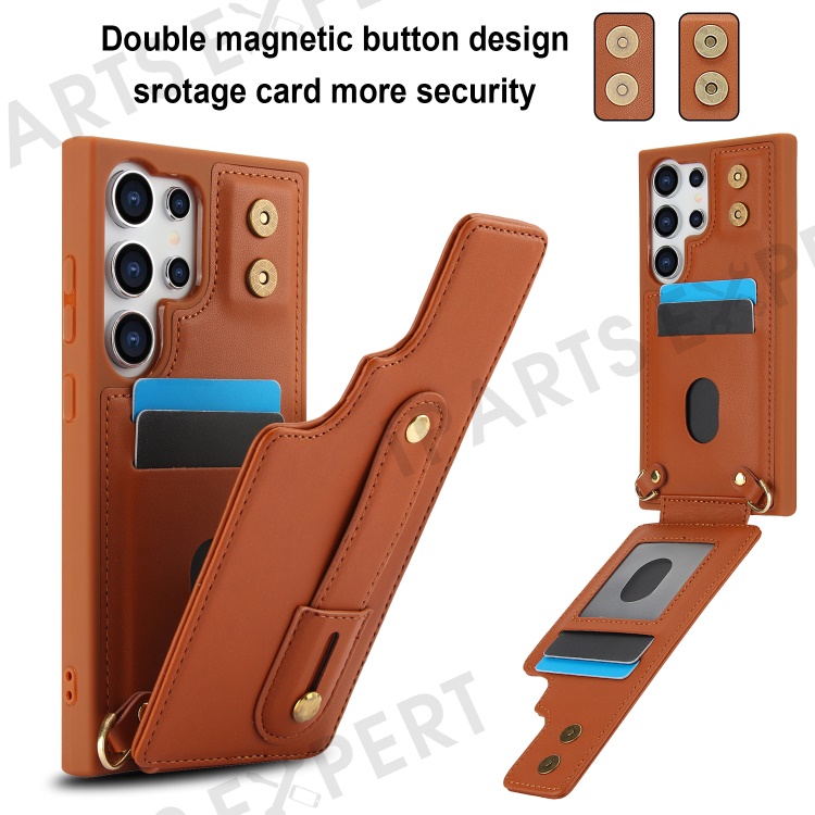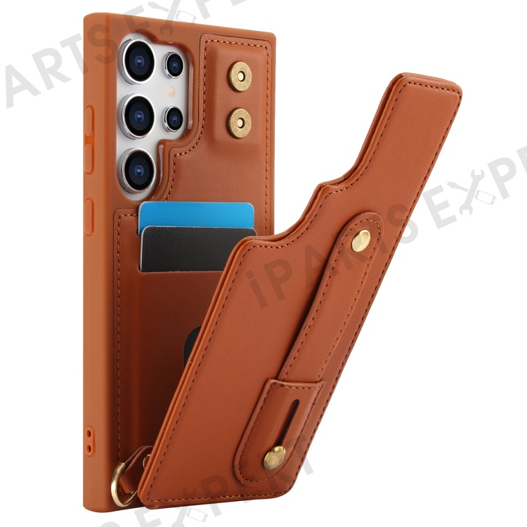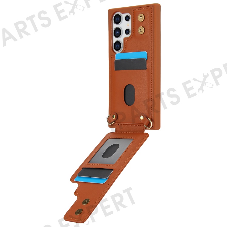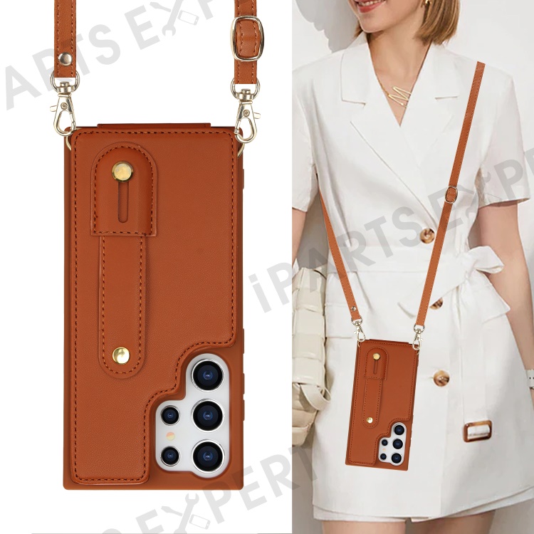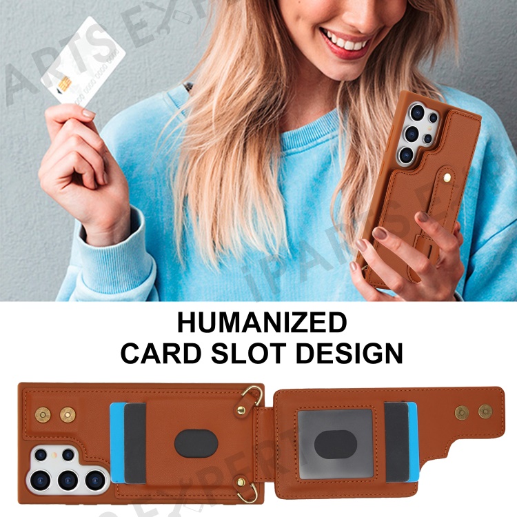 For Samsung Galaxy S25 Ultra Case Kickstand Card Slots Leather Coated TPU Cover with Shoulder Strap - Brown