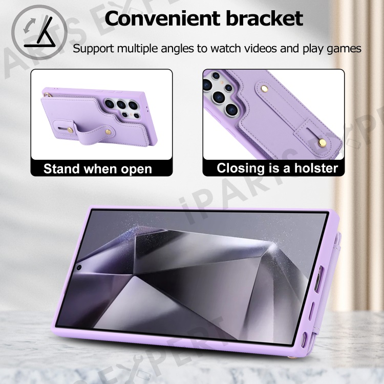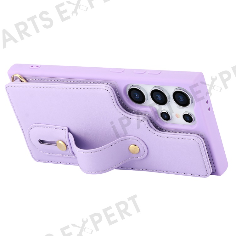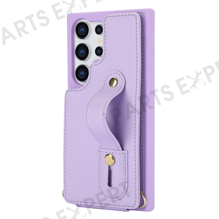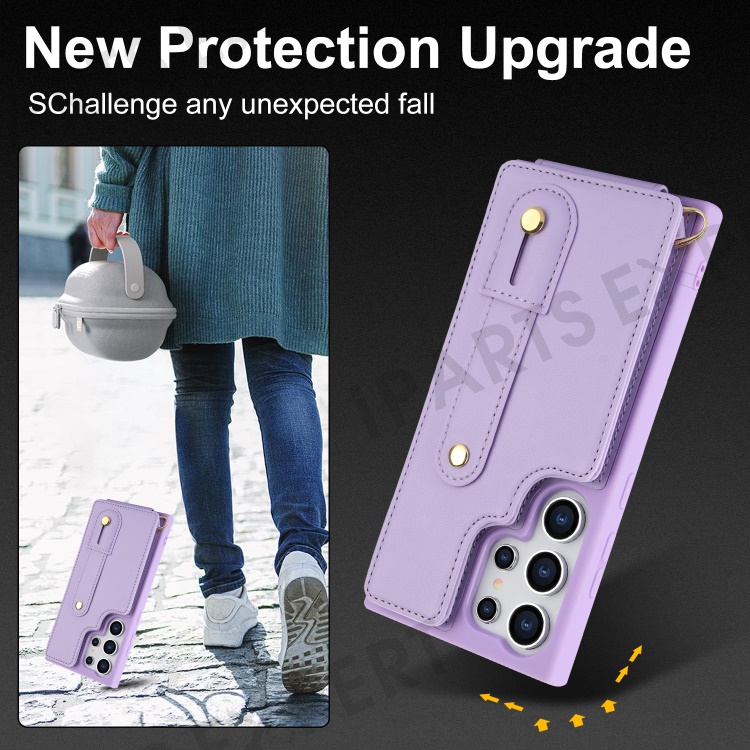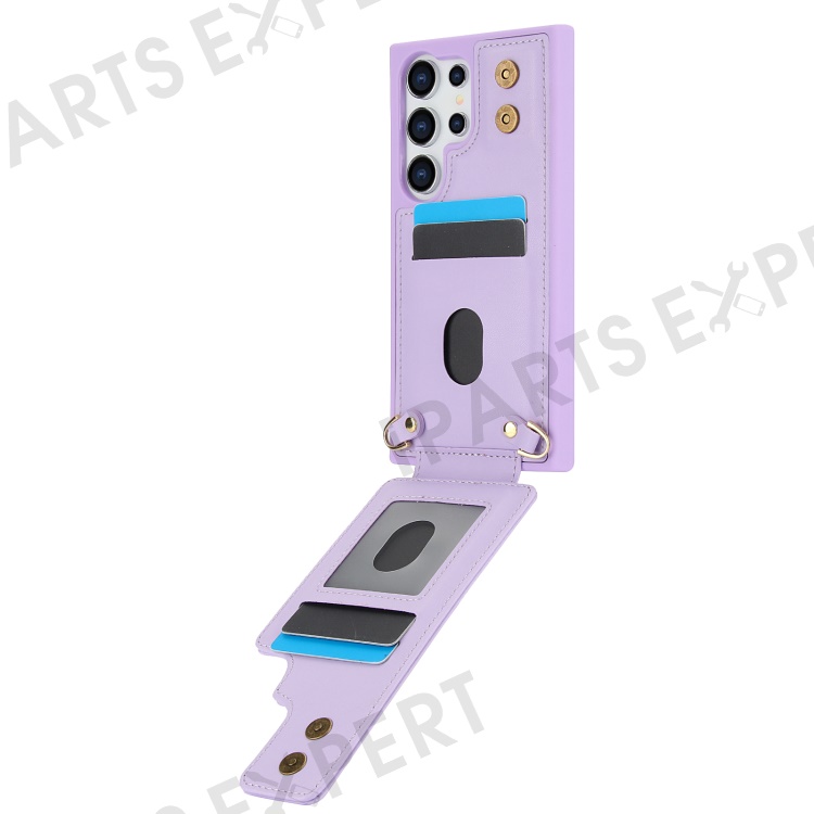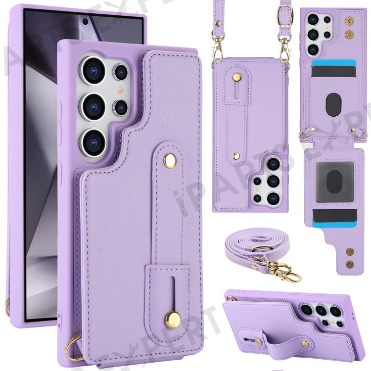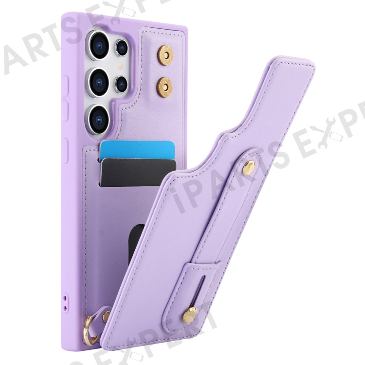 For Samsung Galaxy S25 Ultra Case Kickstand Card Slots Leather Coated TPU Cover with Shoulder Strap - Purple
