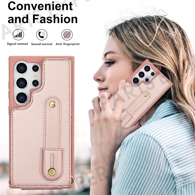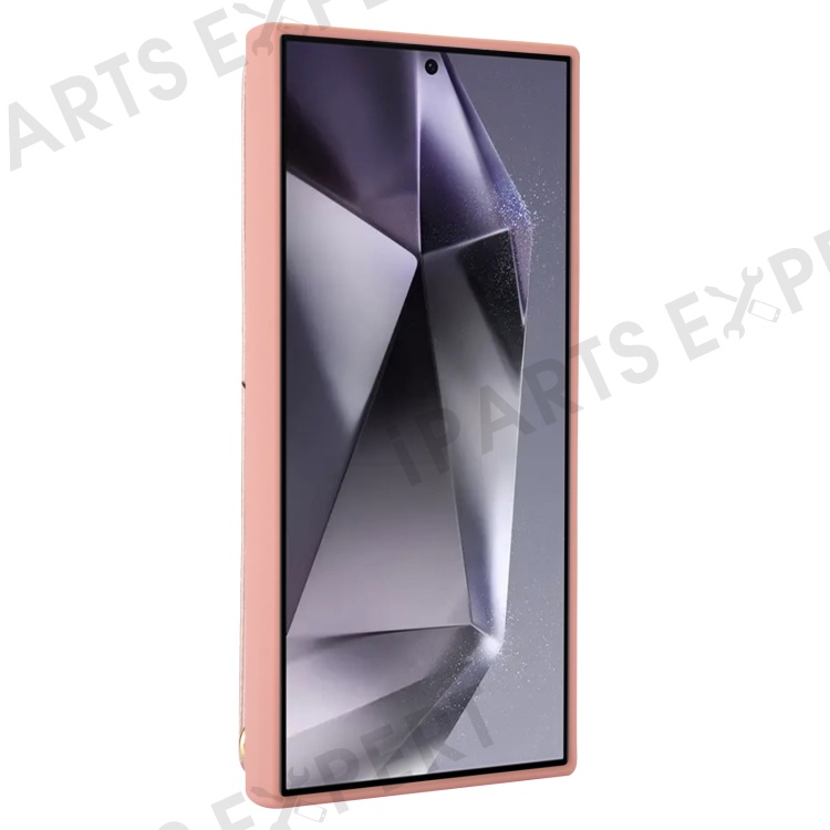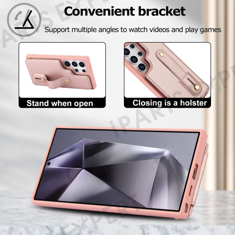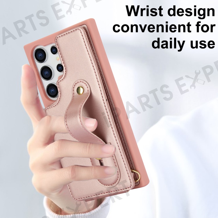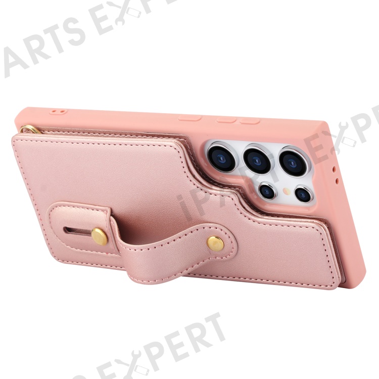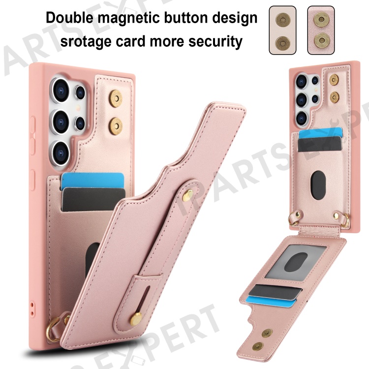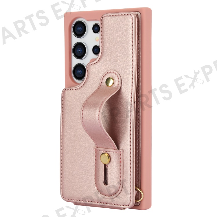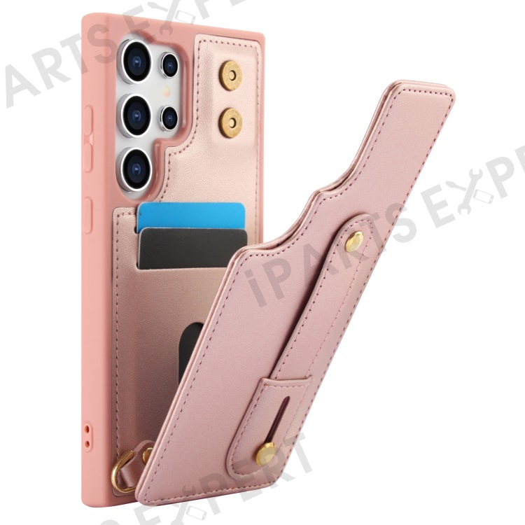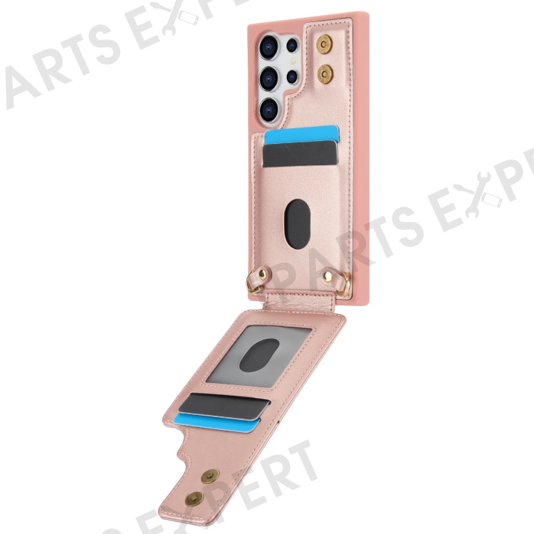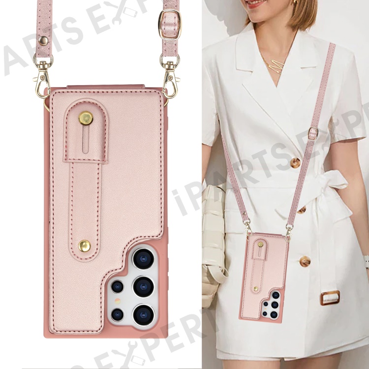 For Samsung Galaxy S25 Ultra Case Kickstand Card Slots Leather Coated TPU Cover with Shoulder Strap - Rose Gold