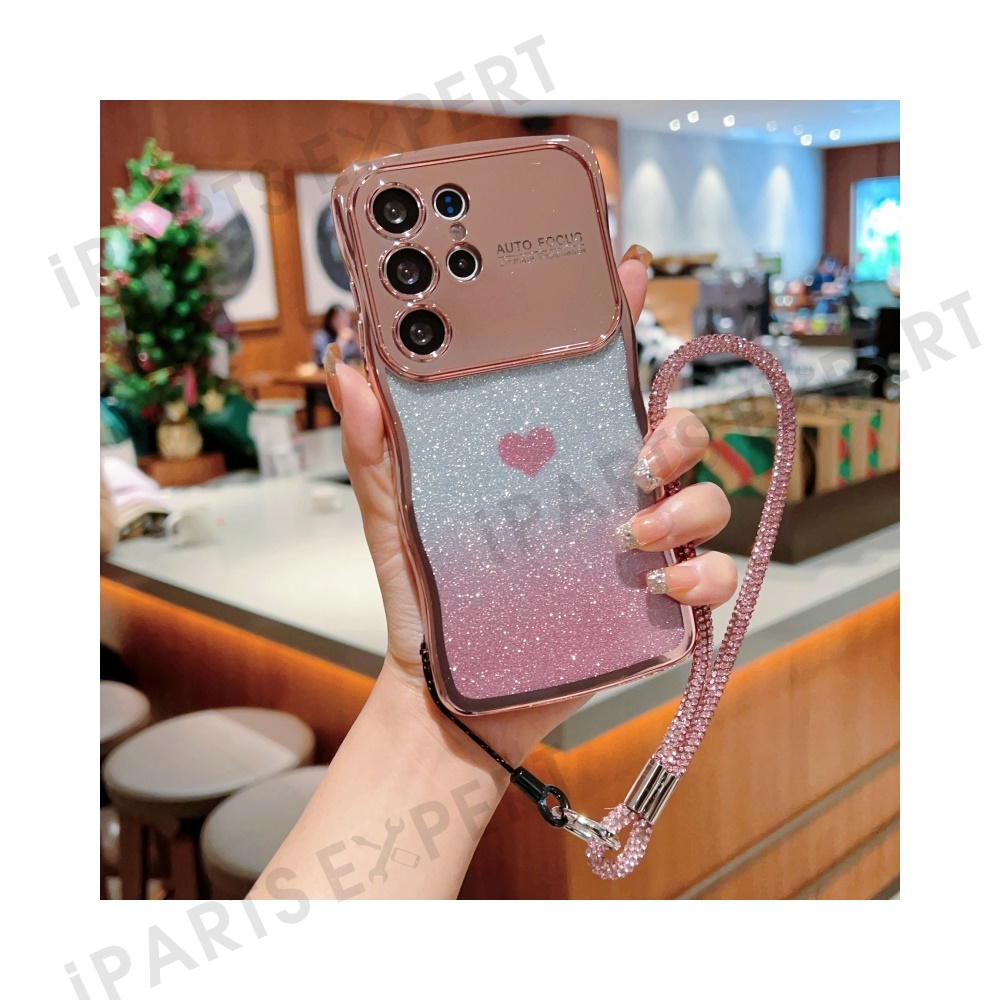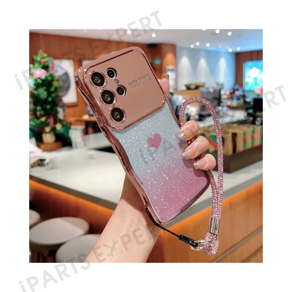 For Samsung Galaxy S25 Ultra Case with Strap Electroplating TPU Phone Cover Love Heart Gradient Glitter - Rose Gold