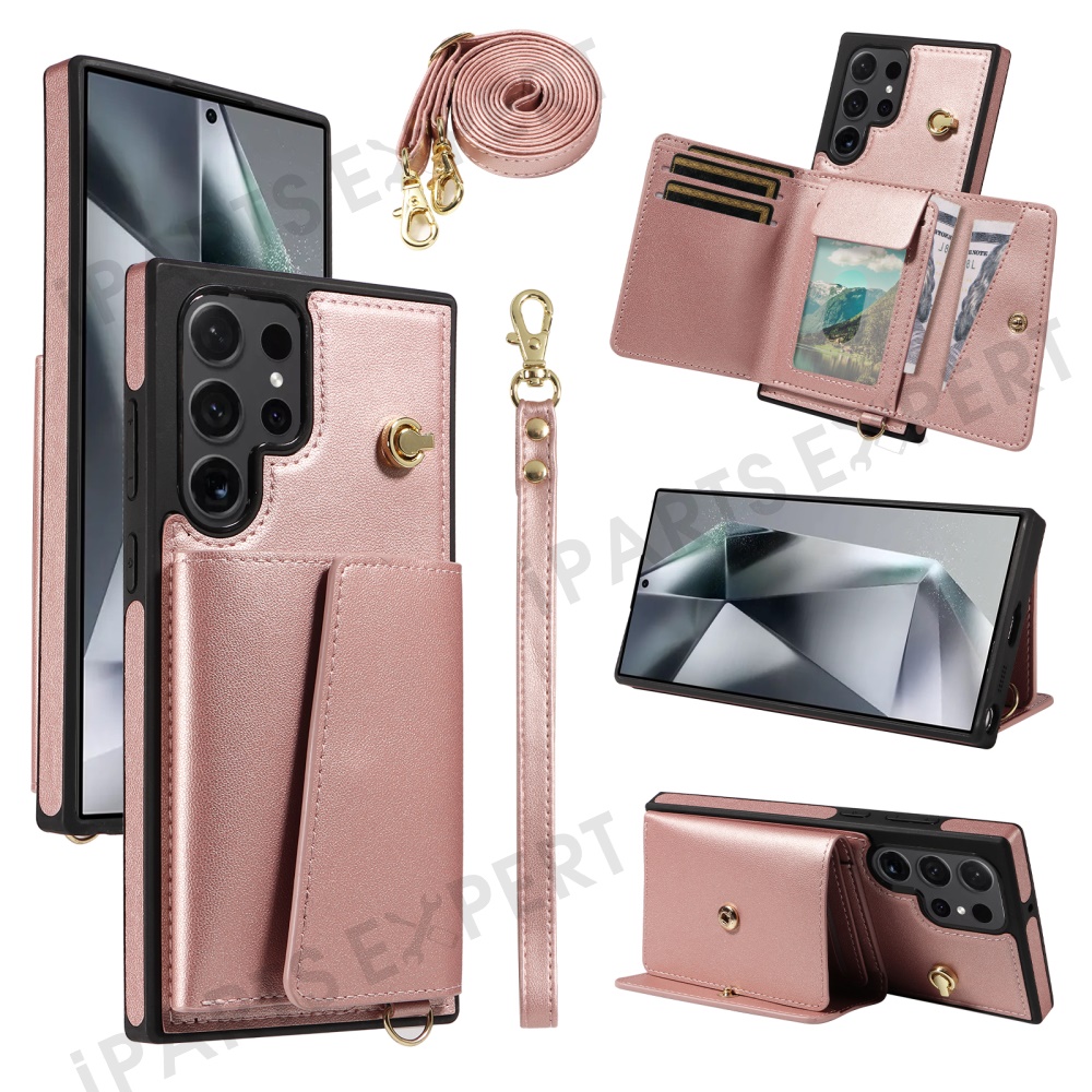 For Samsung Galaxy S25 Ultra Crossbody Phone Case Card Holder Kickstand Leather Coated TPU Mobile Cover - Rose Gold