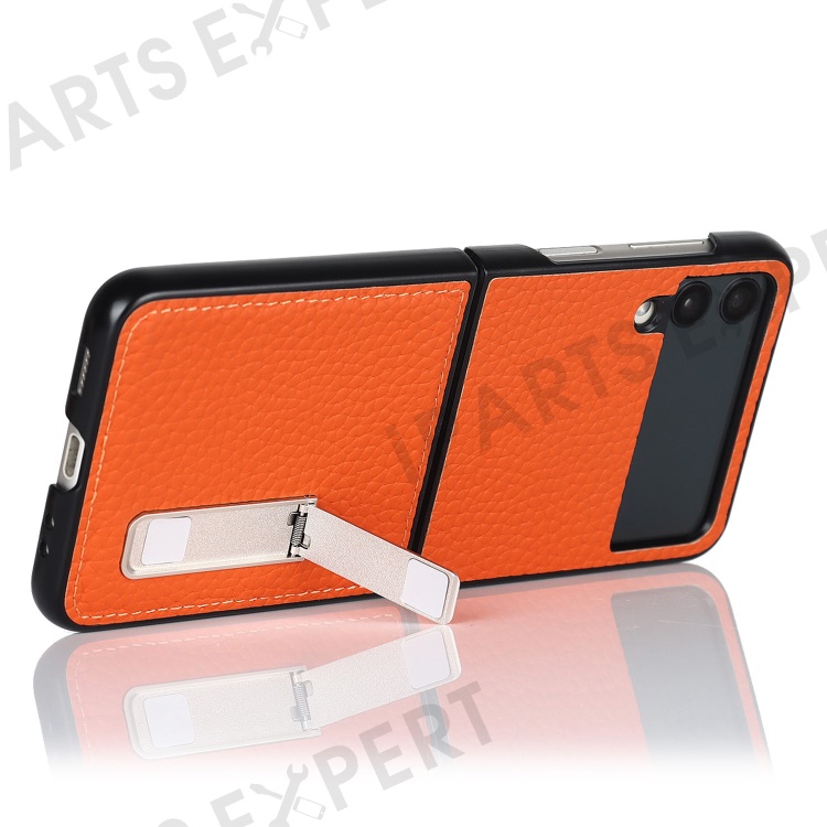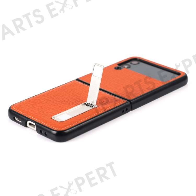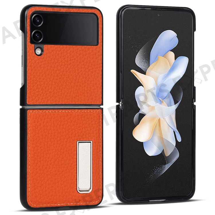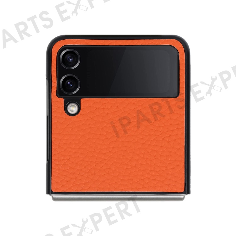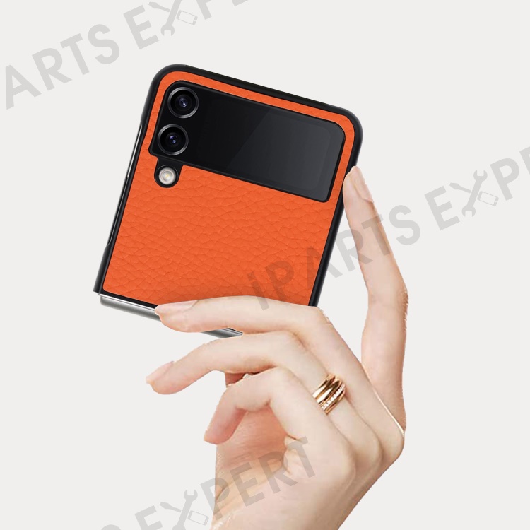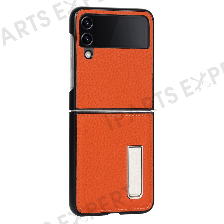 For Samsung Galaxy Z Flip4 5G Folding Phone Case Litchi Texture Genuine Leather Coated PC Cover with Kickstand - Orange