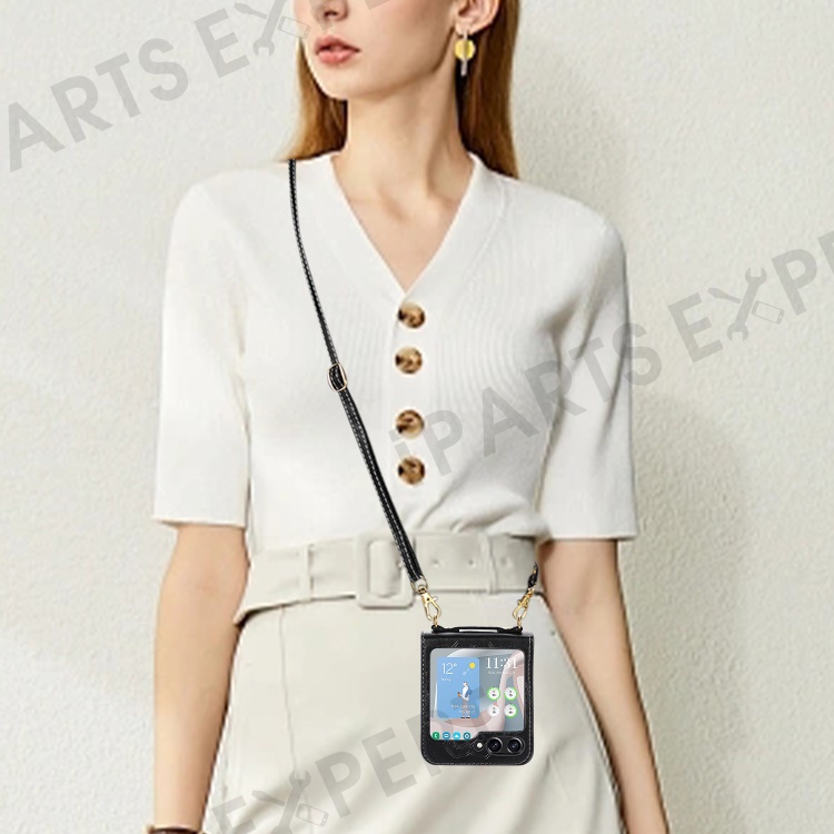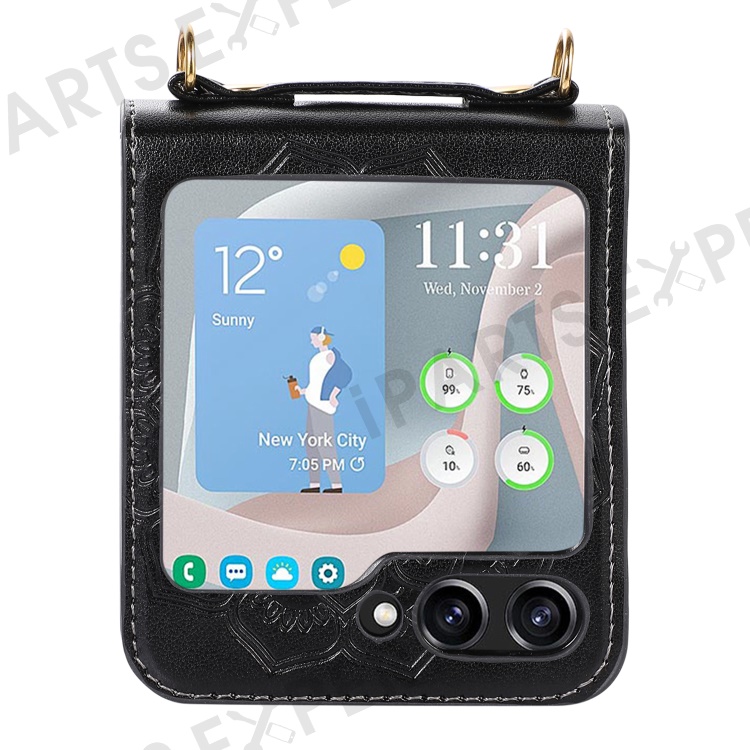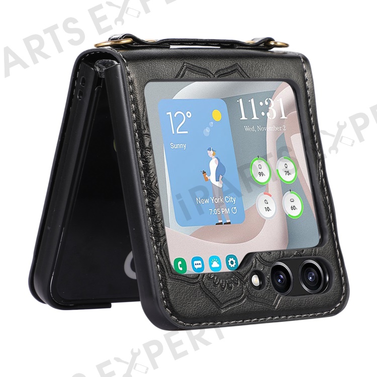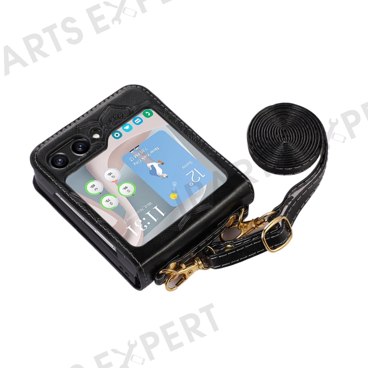 For Samsung Galaxy Z Flip5 5G Flower Imprinted Phone Case Anti-Drop PU Leather PC Cover with Shoulder Strap - Black