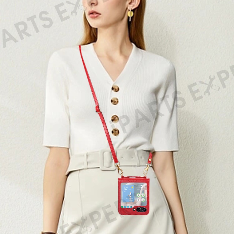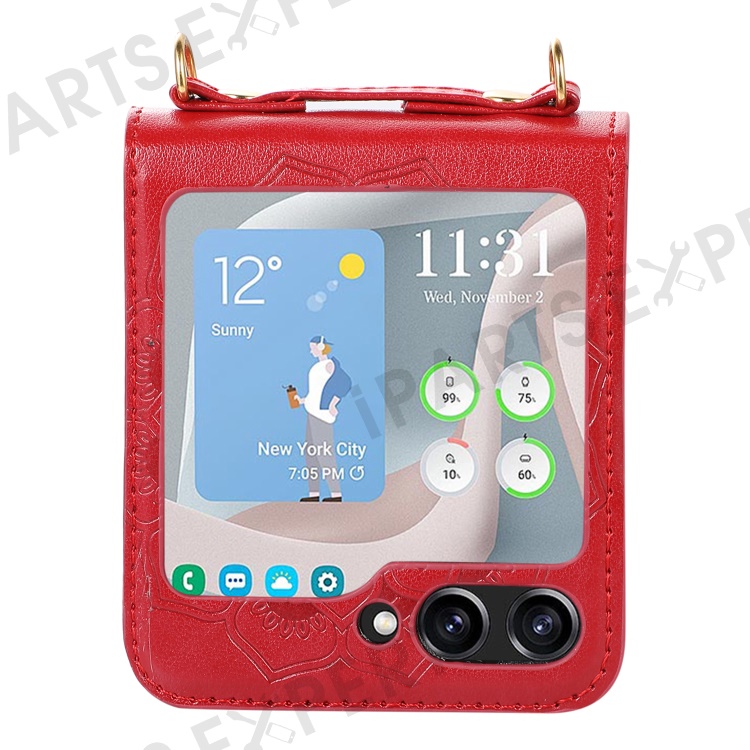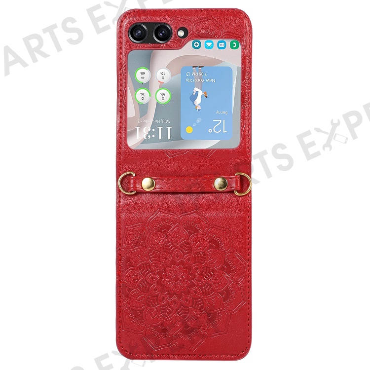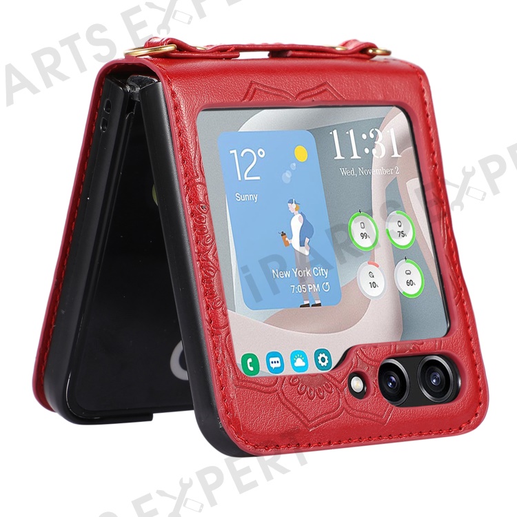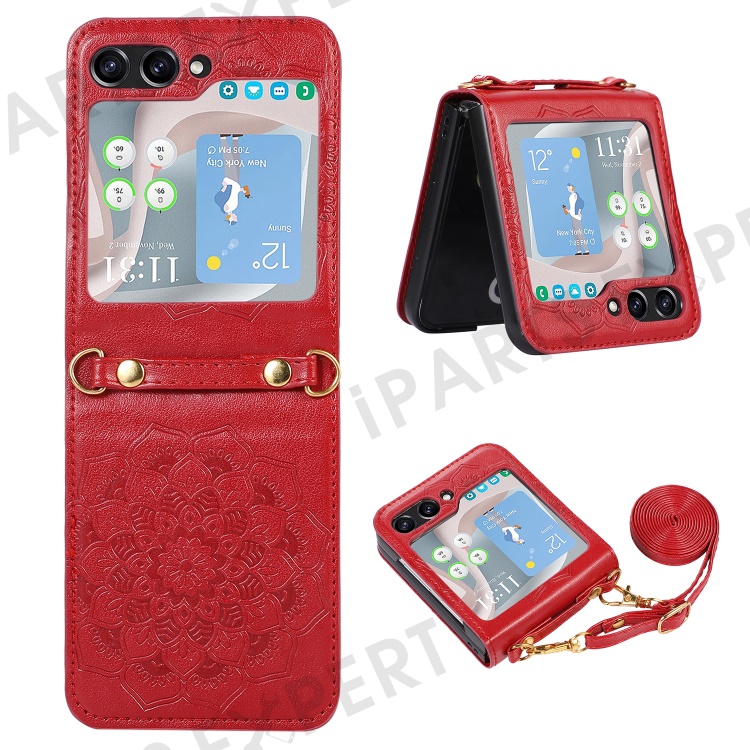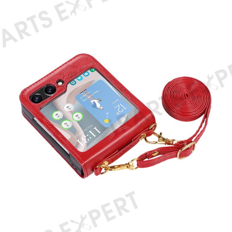 For Samsung Galaxy Z Flip5 5G Flower Imprinted Phone Case Anti-Drop PU Leather PC Cover with Shoulder Strap - Red