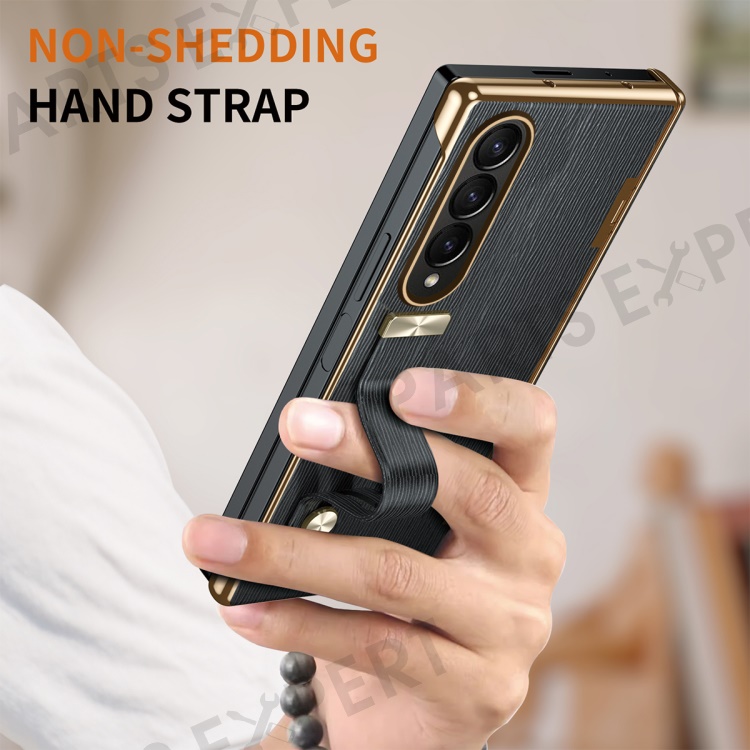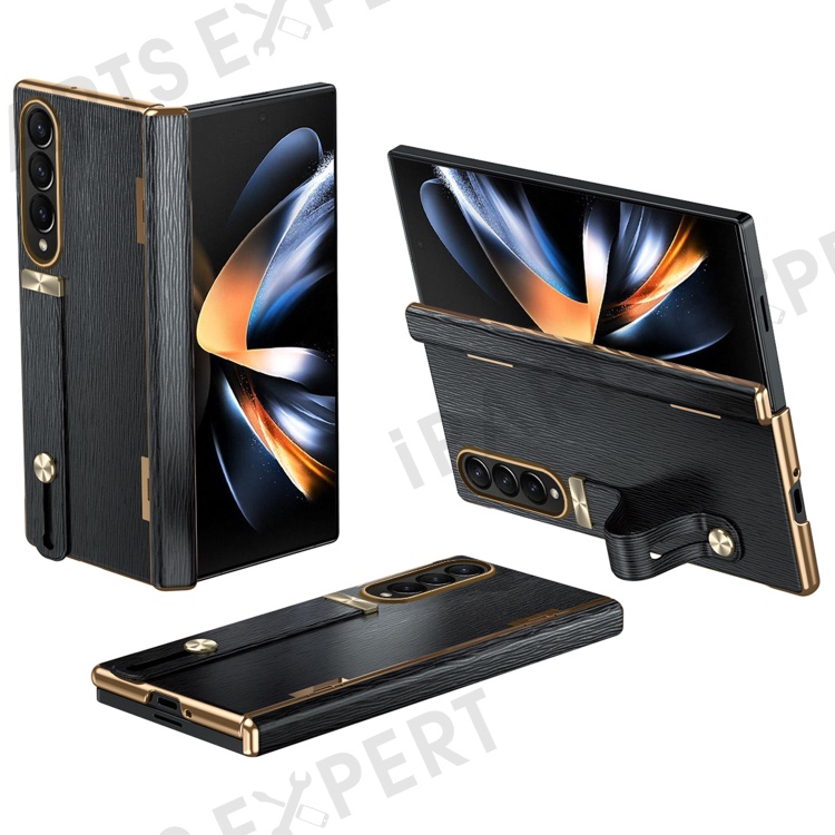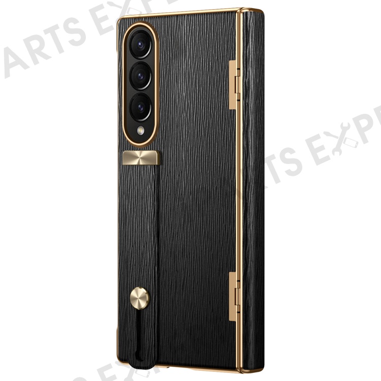 For Samsung Galaxy Z Fold4 5G Case Leather+PC Phone Cover with Retractable Wrist Band Kickstand - Black