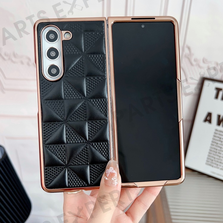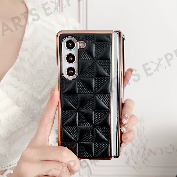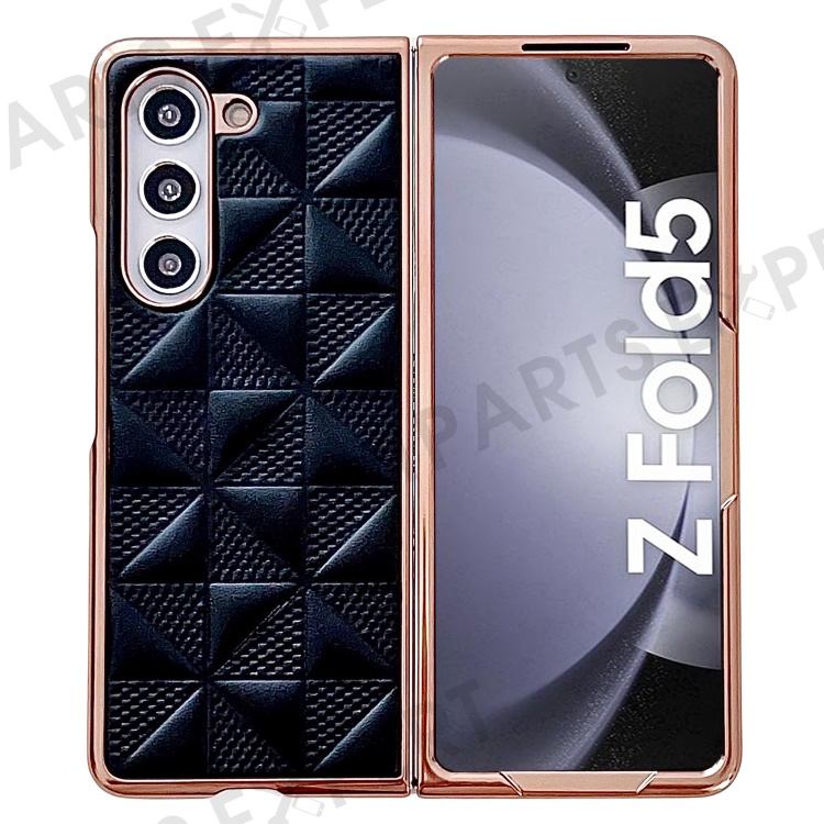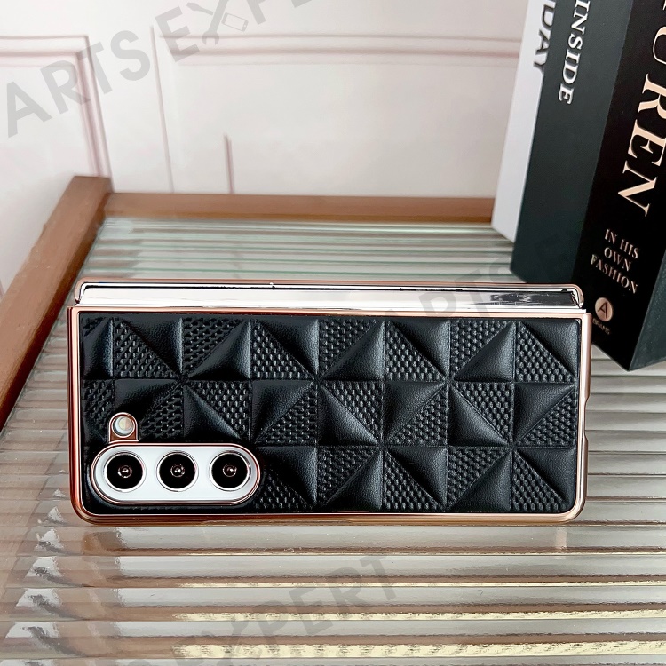 For Samsung Galaxy Z Fold5 5G PU Leather Coated PC Phone Case Grid Pattern Electroplating Cover - Black