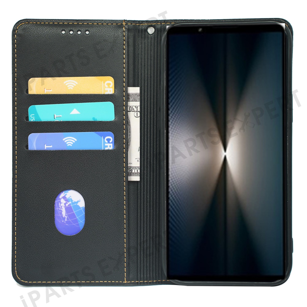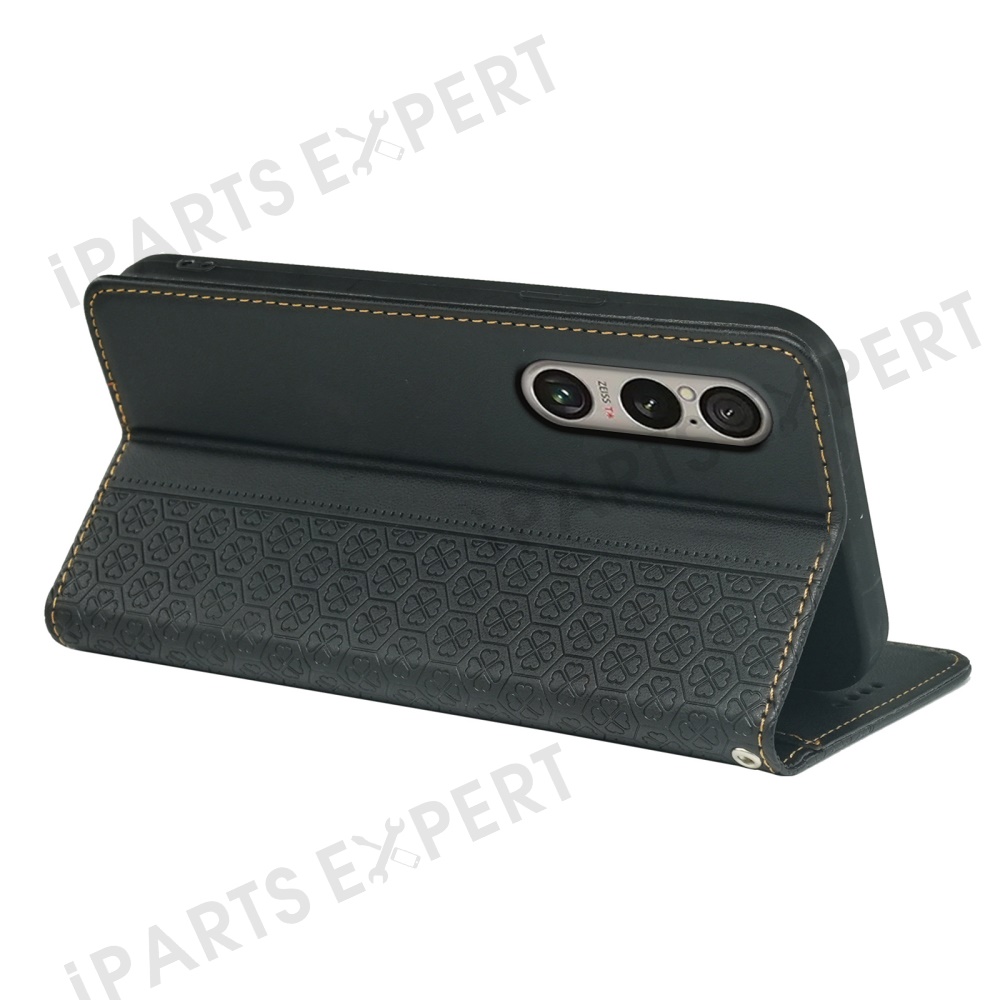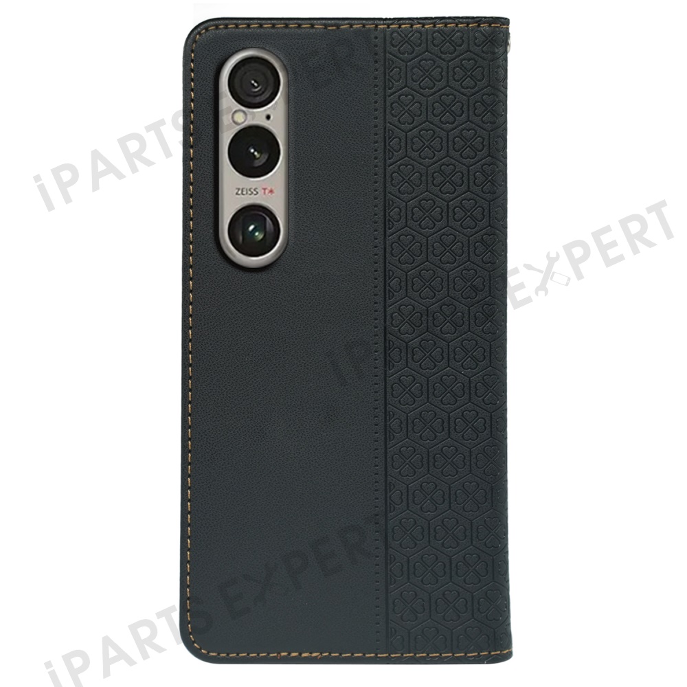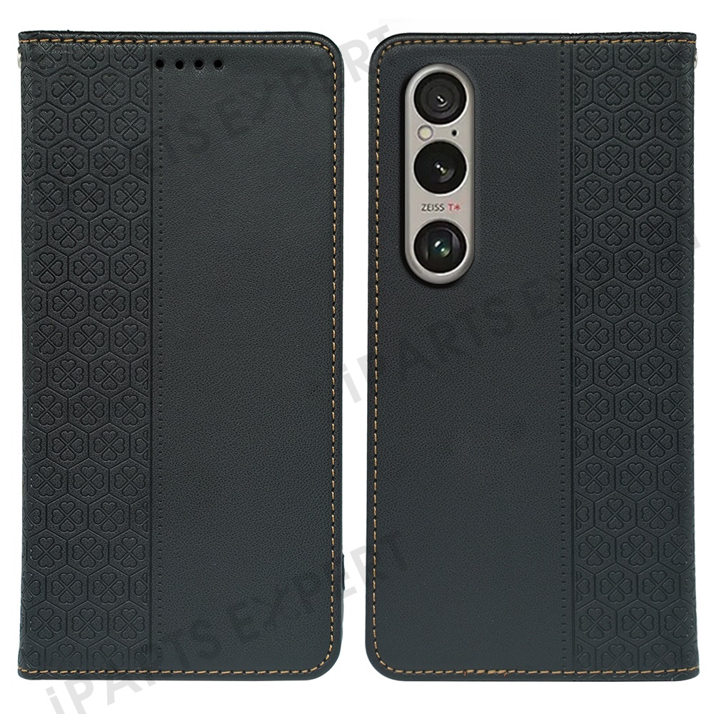For Sony Xperia 1 V Case Four Leaf Clover Leather Flip Phone Cover Stand Wallet - Black